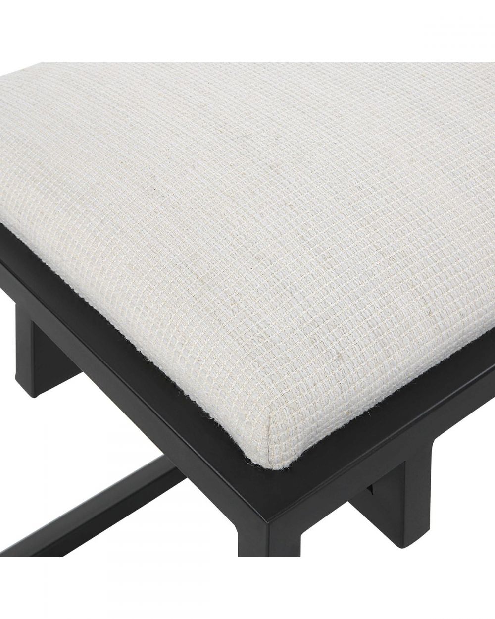 Мягкое сиденье обтянуто качественной тканью из бежевого льна, которая приятна на ощупь и придает банкетке неповторимый шарм. Этот материал является устойчивым к износу и легким в уходе, что делает его идеальным для повседневного использования.
