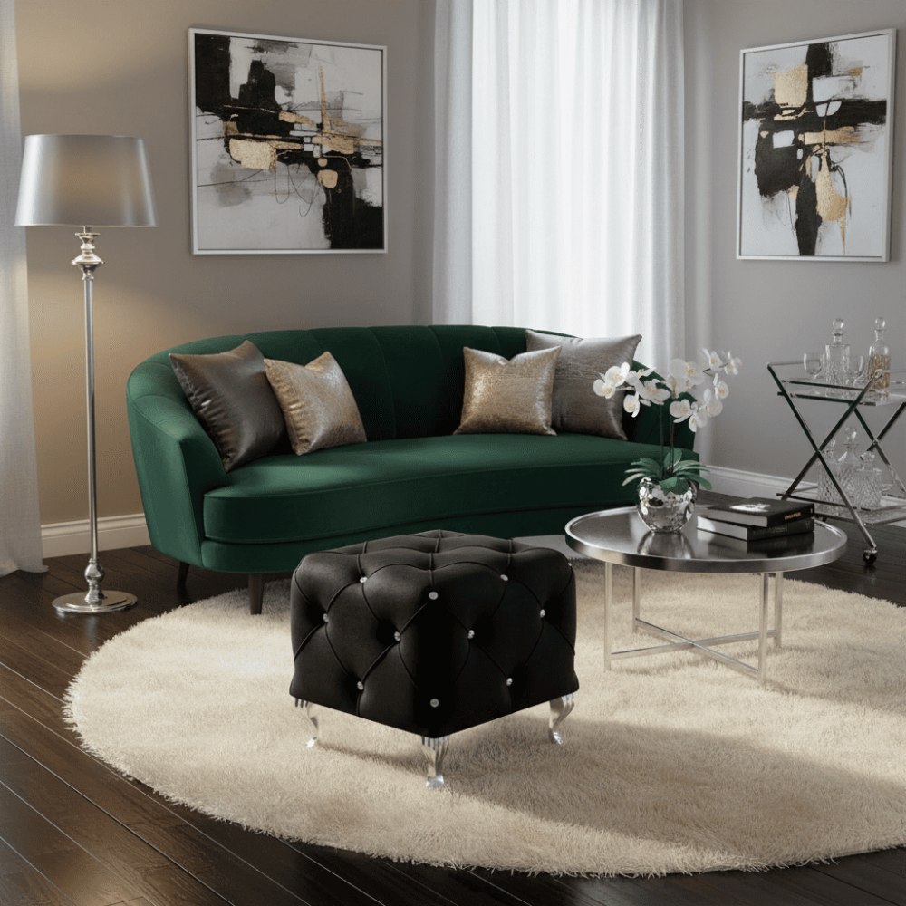 Иногда в интерьере не хватает последнего штриха: места, куда можно поставить чашку, присесть, положить ноги или просто добавить акцент. Обычные банкетки выглядят скучно, а полноценные кресла занимают слишком много места. Хочется найти предмет, который будет и функциональным, и украшением. → Решение: пуф Signal Hestia на высоких металлических ножках. Это компактный, но очень выразительный аксессуар. Квадратная форма 50х50 см, высота 46 см и эффектная обивка из черного велюра с кристаллами делают его самостоятельным арт-объектом.