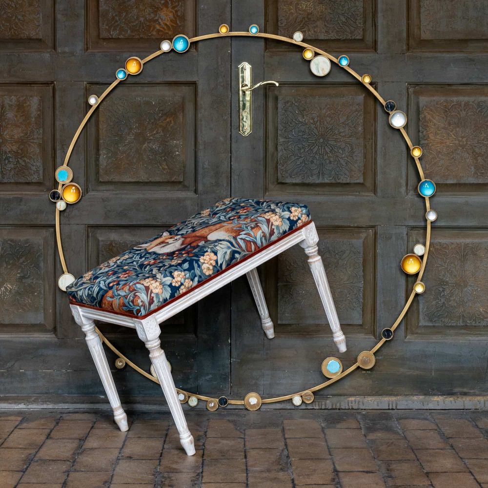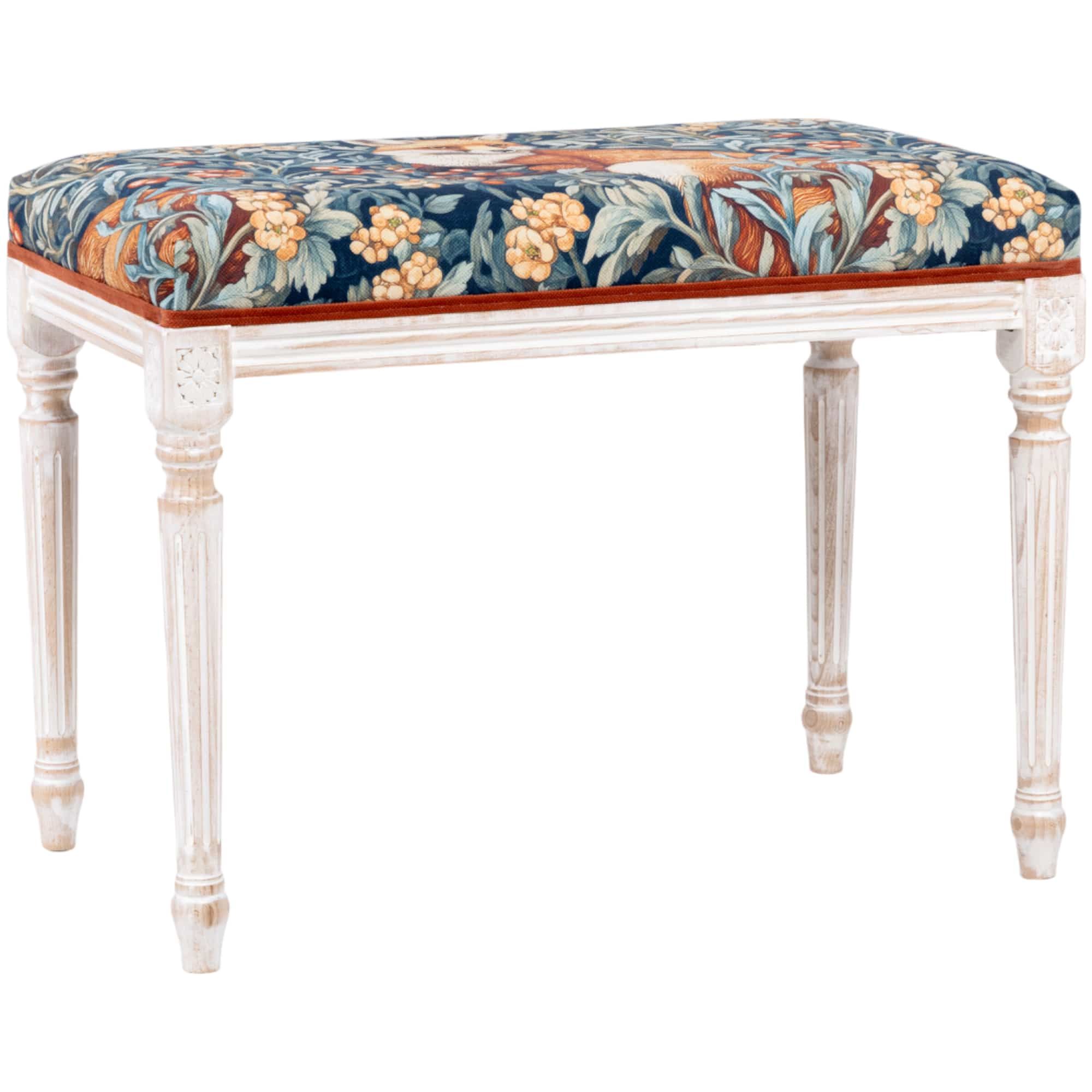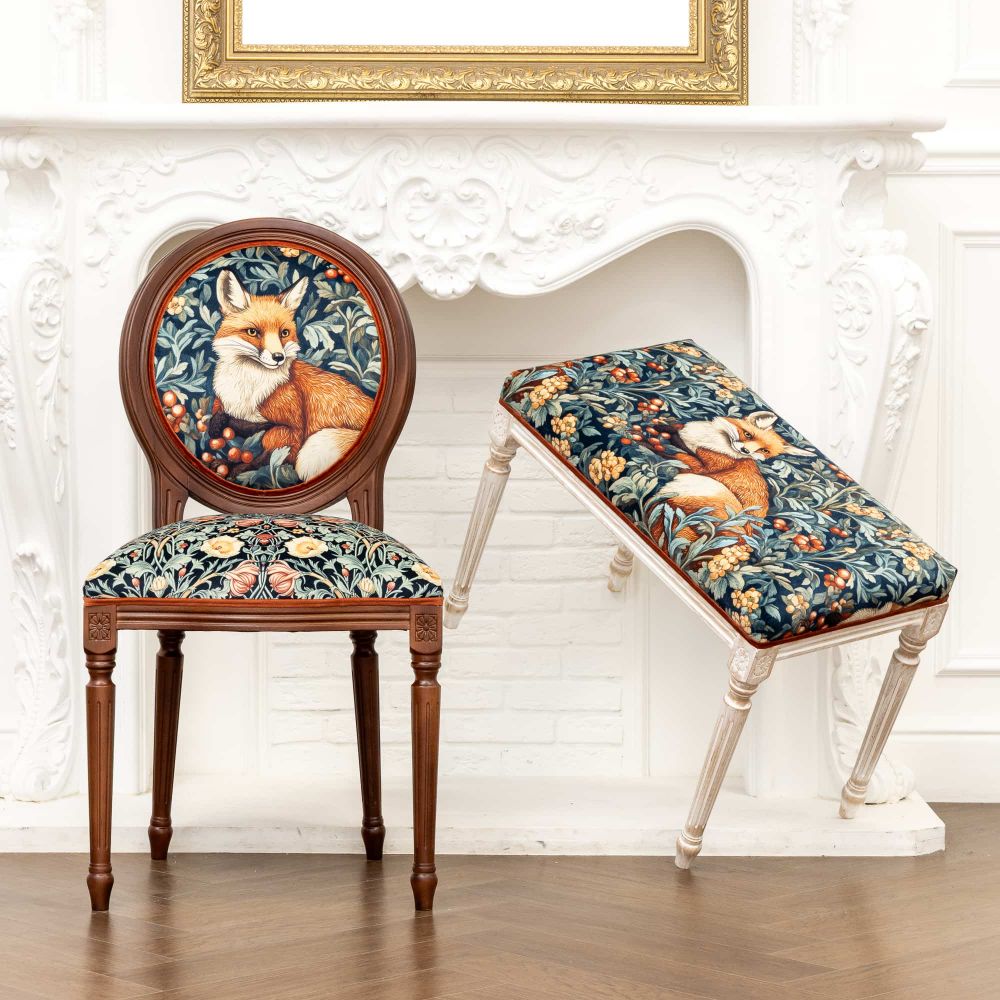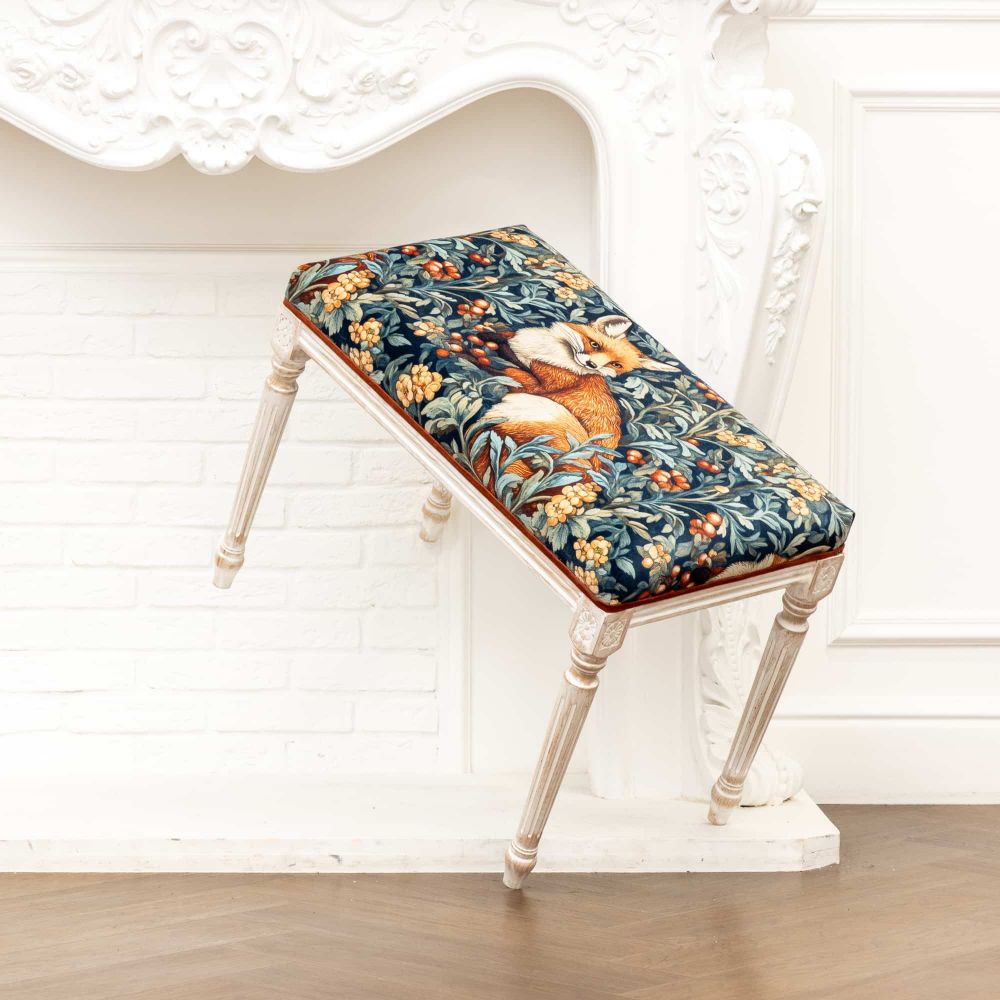 Банкетка «Бал сказок. Лиса» – это чарующая встреча английской классики Уильяма Морриса и сказочного волшебства. В центре внимания – лукавая лисица, облаченная в огненную шубку, окруженная изумрудным хороводом листьев, россыпью ярких цветов и рубиновых ягод. Пышный хвост с кисточкой цвета первого снега и белоснежная манишка добавляют образу игривости и лучистого тепла.