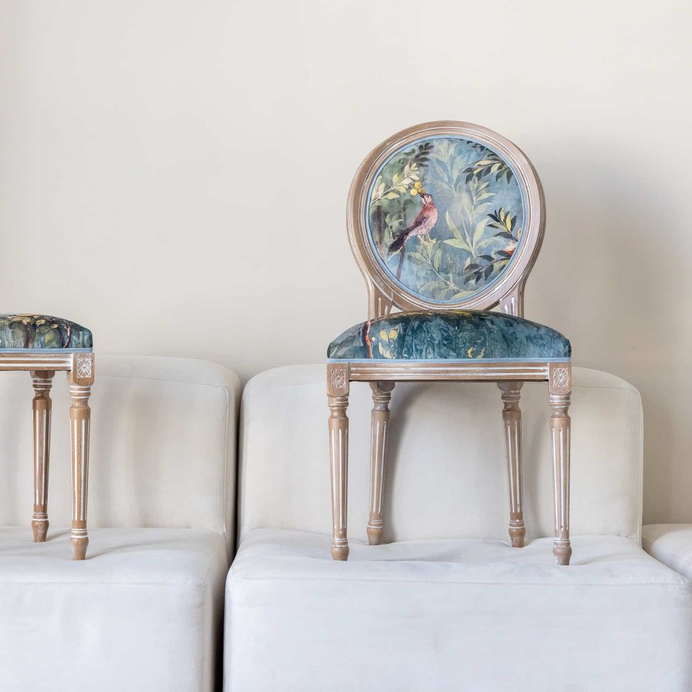 Небесная лазурь, изумрудная зелень листвы и солнечные блики – вся палитра летнего сада запечатлена на обивочной ткани. Оторочка лазурного цвета добавляет образу невесомости и ассоциируется с тихой гаванью, куда хочется возвращаться после суетного дня.