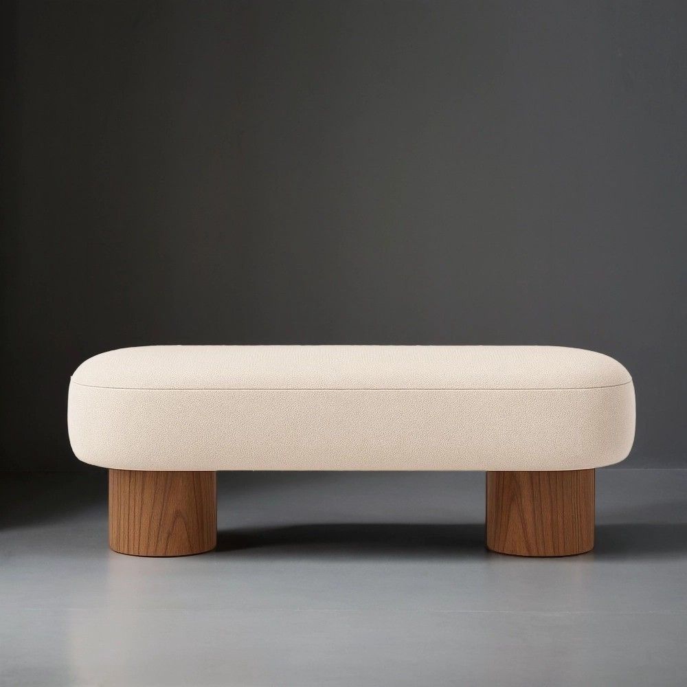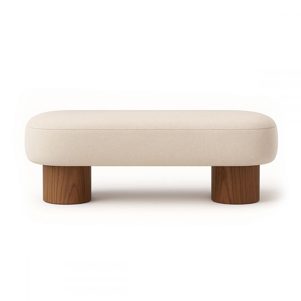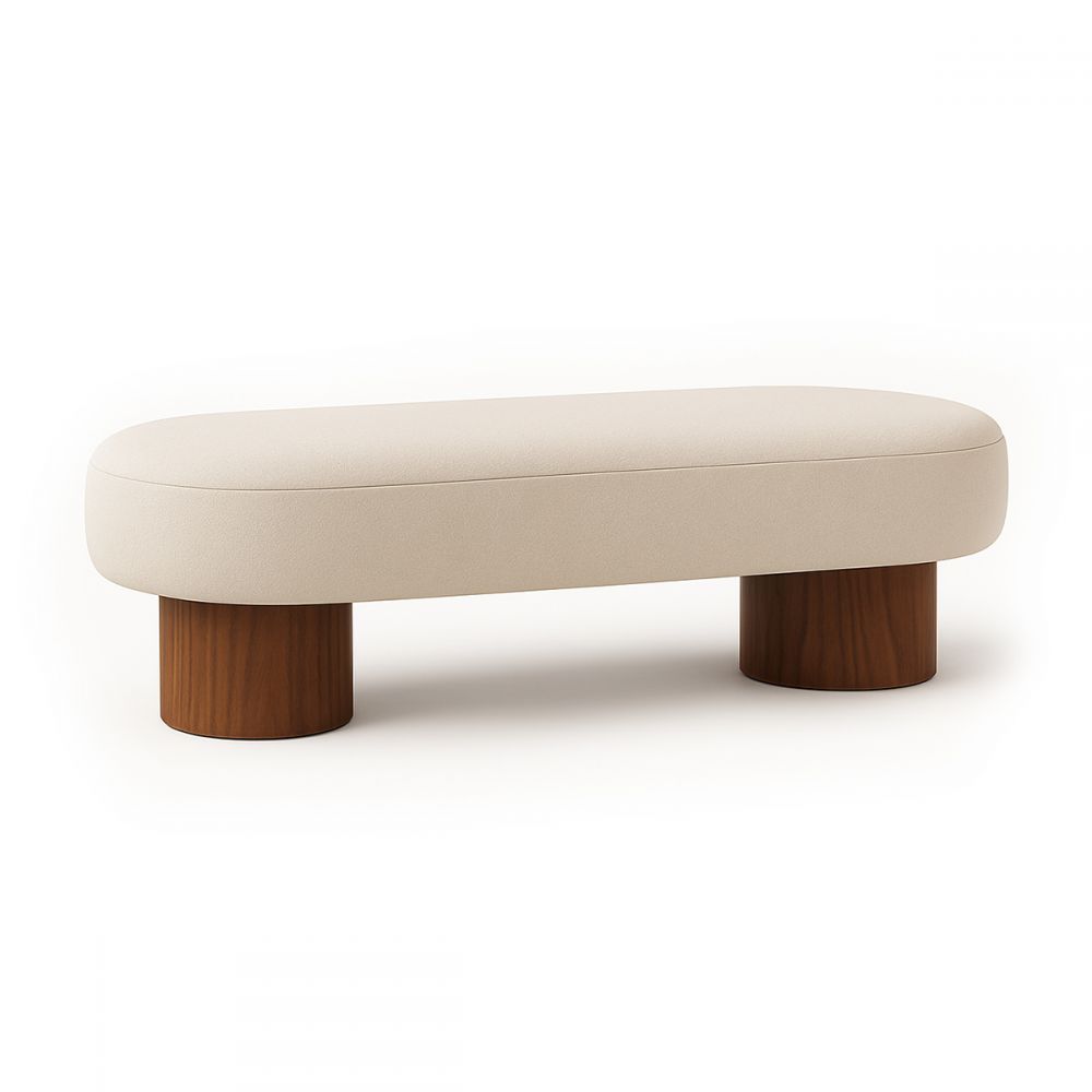 Две цилиндрические деревянные ножки с выразительной текстурой массива придают банкетке устойчивость и сдержанную элегантность. Натуральное дерево контрастирует с мягкой обивкой, создавая гармоничный баланс материалов.