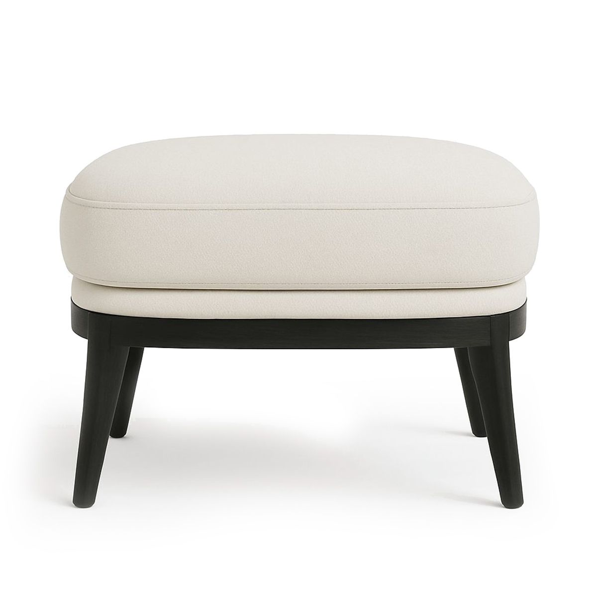 Контрастные черные деревянные ножки добавляют композиции графичную четкость и завершенность. Они подчеркивают устойчивость конструкции, но при этом сохраняют легкость. Темный цвет ножек создает эффектный контраст с мягкой бежевой обивкой, делая пуф заметным, но не кричащим акцентом.