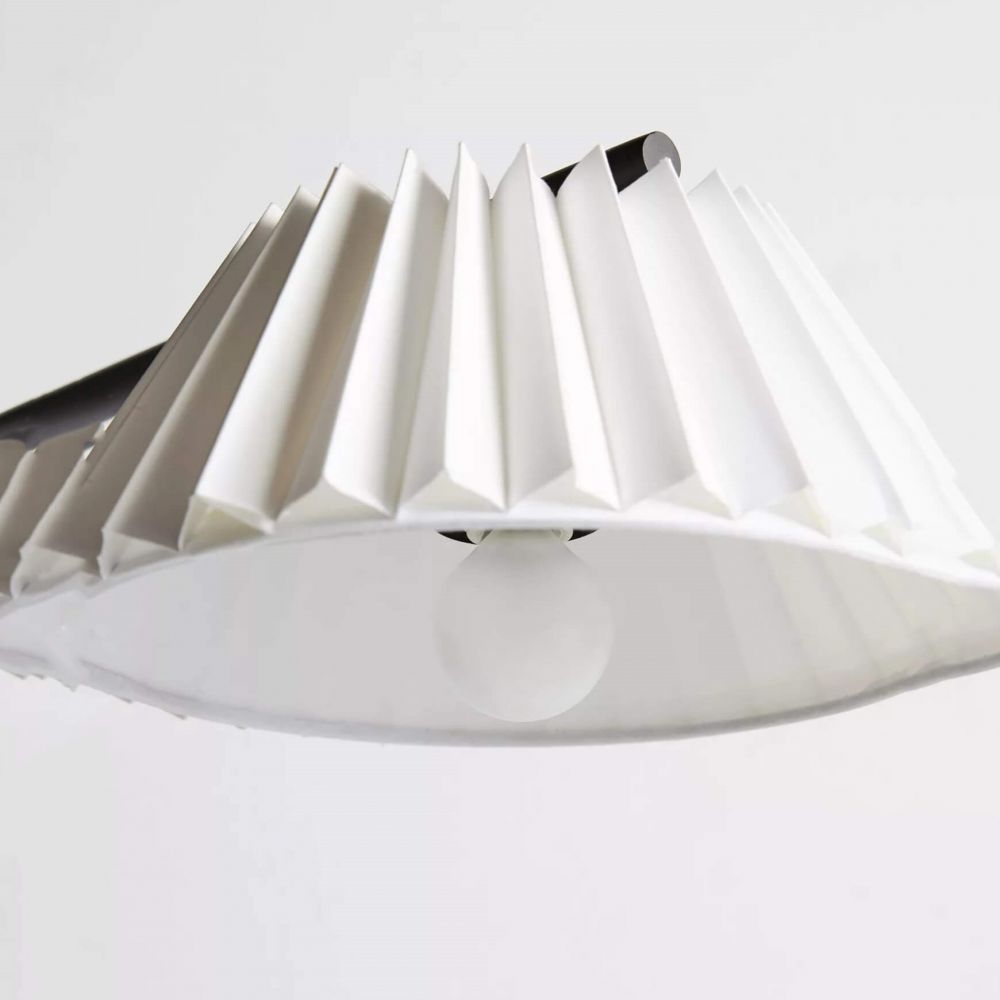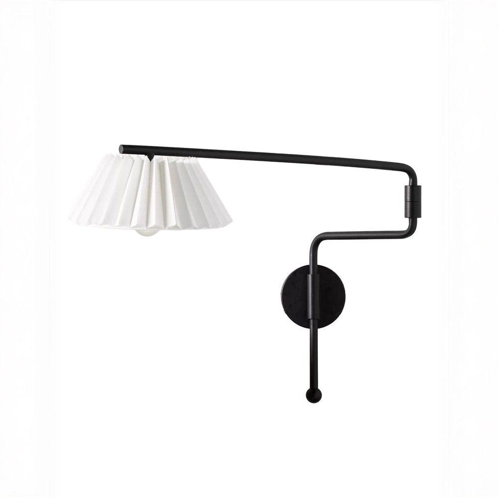 Металлический корпус с матовым черным покрытием устойчив к царапинам и легко очищается. Плиссированный хлопковый абажур равномерно рассеивает свет и создает мягкое, комфортное освещение без бликов. Поворотный механизм надежен и выдерживает многократные изменения положения. Цоколь E14 – стандартный для небольших лампочек, легко найти замену в любом магазине.