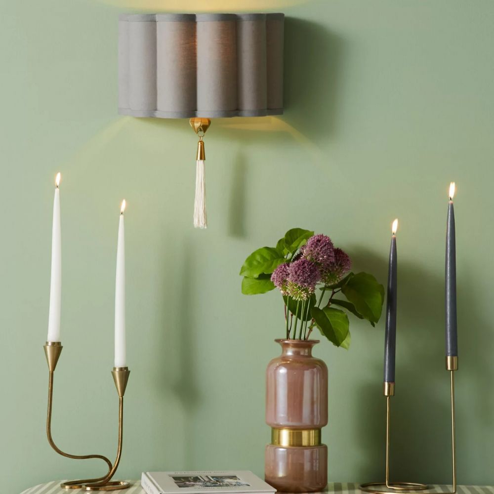 Металлическая фурнитура с латунным покрытием устойчива к царапинам и не тускнеет. Хлопковый абажур и кисточка – натуральные материалы, которые приятны на ощупь и создают особую атмосферу. Кисточка крепится надежно, но при желании ее можно снять для чистки. Цоколь E14 позволяет использовать любые компактные лампочки, включая светодиодные.