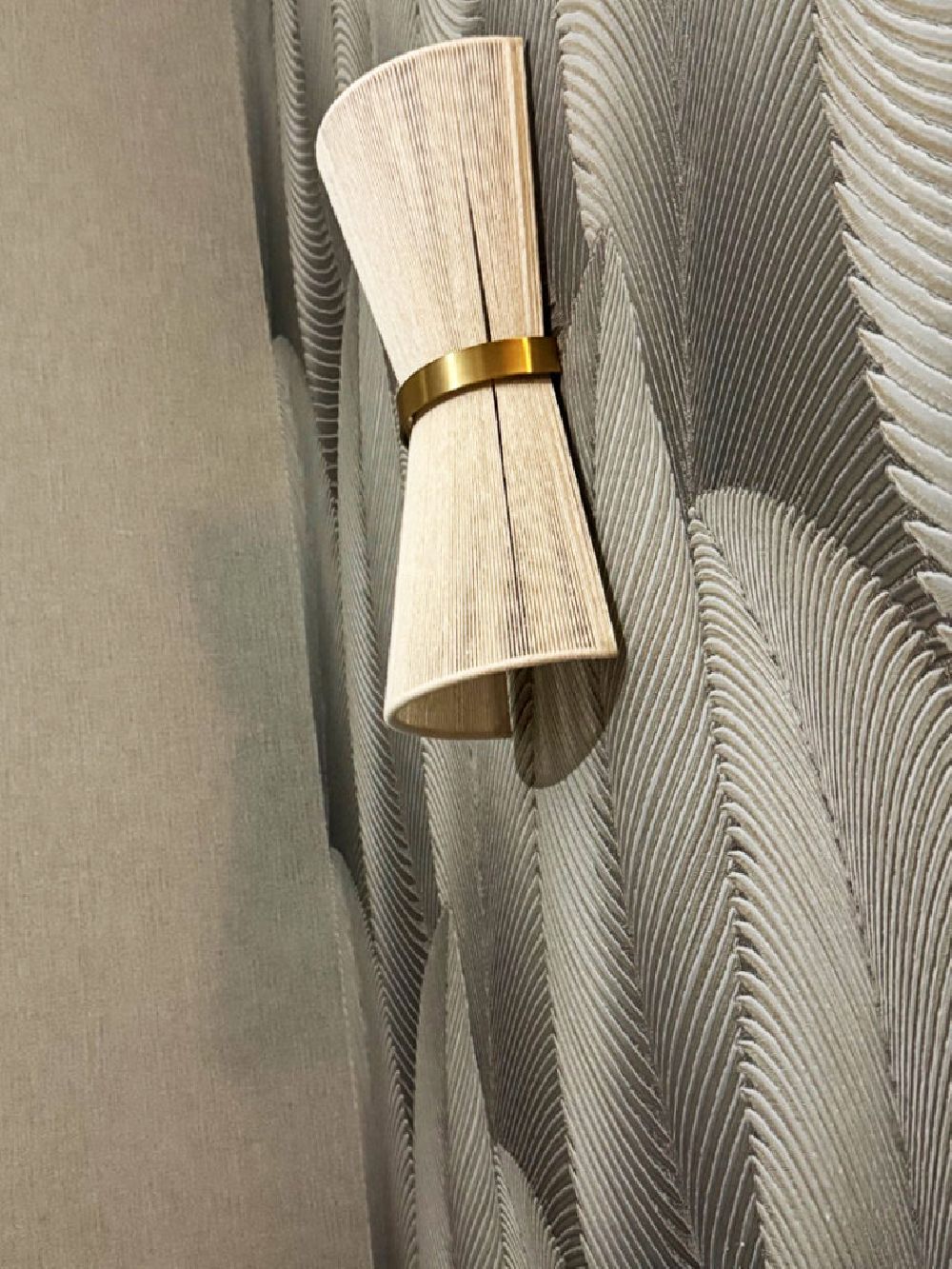 Настенный светильник «Сесил» решает эту задачу с редким изяществом. Его главная особенность – абажур из бежевого текстиля необычной формы. Это не строгий цилиндр и не классический конус – мягкие изгибы создают живой, скульптурный силуэт, который притягивает взгляд и делает светильник самостоятельным декоративным элементом.