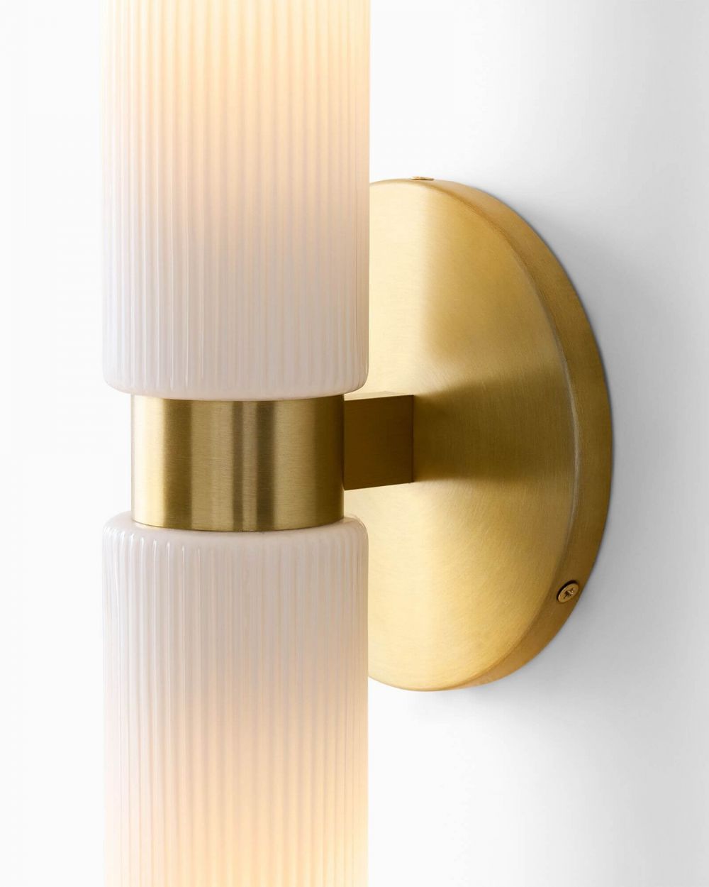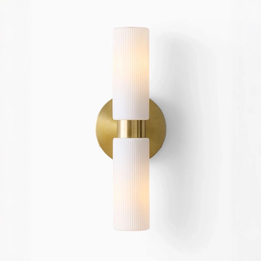 Золотое двойное бра «Батлер» с белыми опаловыми плафонами решает эту задачу с безупречным вкусом. Два рифлёных стеклянных плафона цилиндрической формы закреплены на одном основании из латуни, создавая симметричную, гармоничную композицию. Теплый блеск металла и фактура стекла делают светильник самостоятельным декоративным элементом.