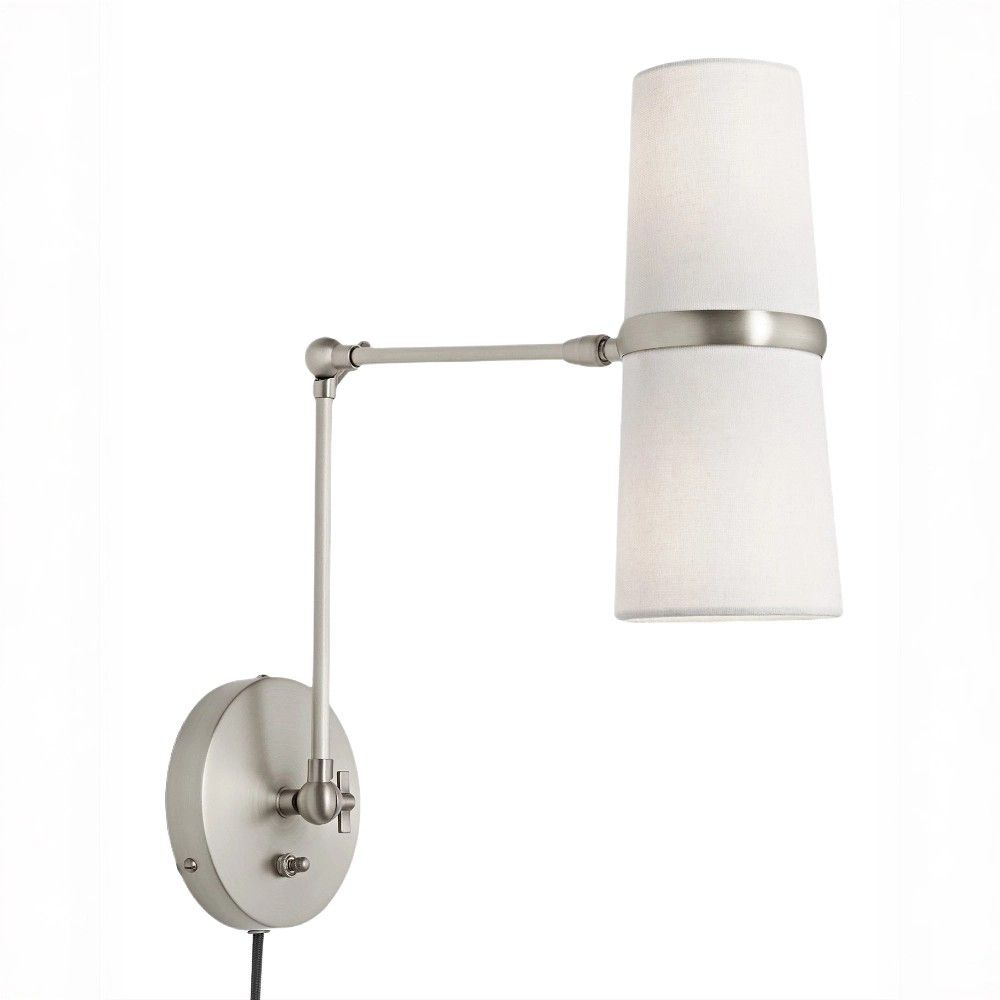 Металлический корпус с никелевым покрытием устойчив к царапинам и не тускнеет. Тканевые абажуры из хлопка равномерно рассеивают свет. Подвижный шарнир надежен и выдерживает многократные изменения положения. Длинный провод в тканевой оплетке – не только стильный акцент, но и практичное решение для размещения светильника вдали от розетки. Два независимых цоколя E14 позволяют использовать любые лампочки.