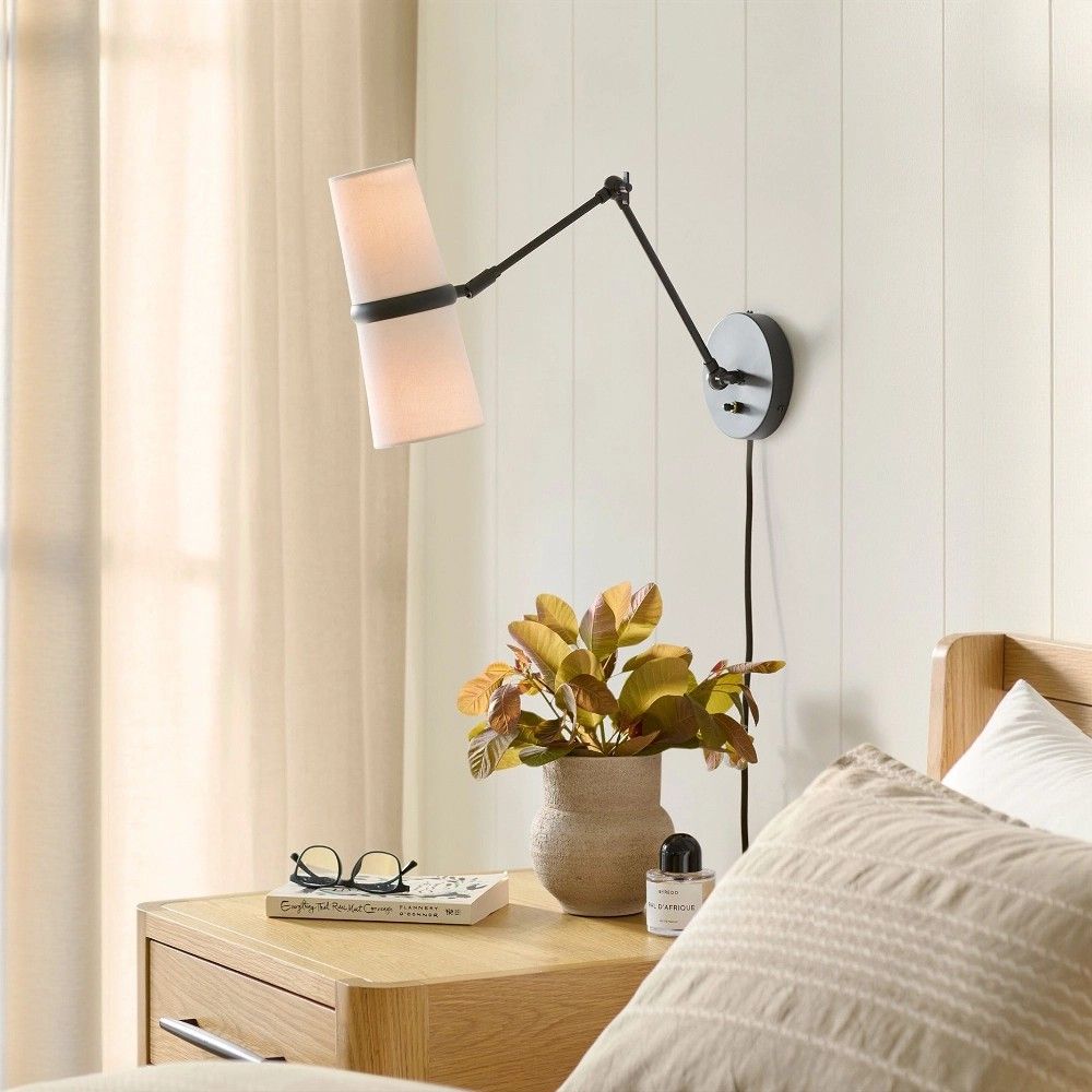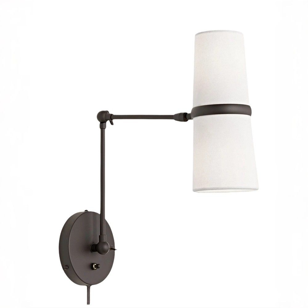 Черное бра «Флемиш» на раскладном шарнире решает эту задачу с редкой элегантностью. Два конусных тканевых абажура закреплены на подвижной конструкции, которая позволяет направлять свет под любым углом. Хотите читать – направьте абажуры вниз. Хотите мягкий фоновый свет – разверните их к стене или вверх. Шарнир фиксируется надежно, сохраняя заданное положение.