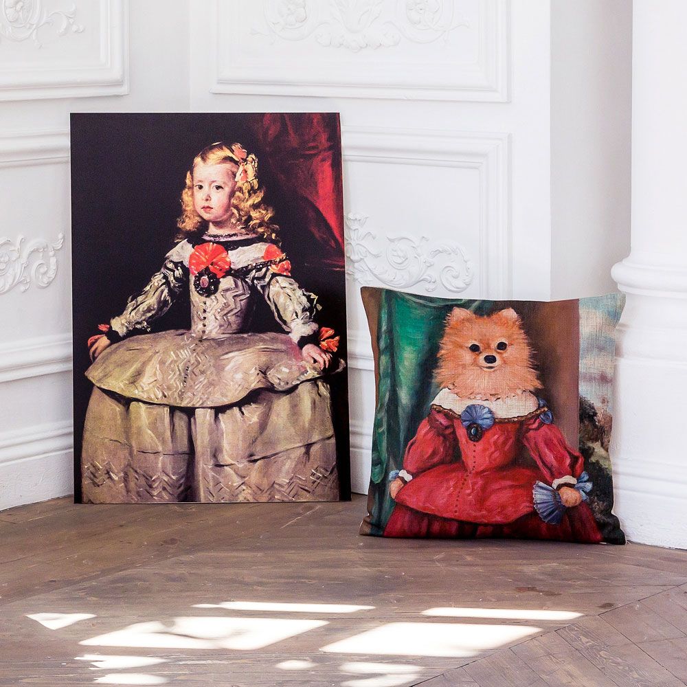"Музейный экспонат" - один из полусотни коллекционных дизайнов подушек, десятков мягких стульев и репродукций на холсте в роскошных картинных рамах, украшенных забавными портретами придворных персонажей. Отборные детали сливаются в единый дизайн, созданный художником словно бы по Вашему индивидуальному заказу.