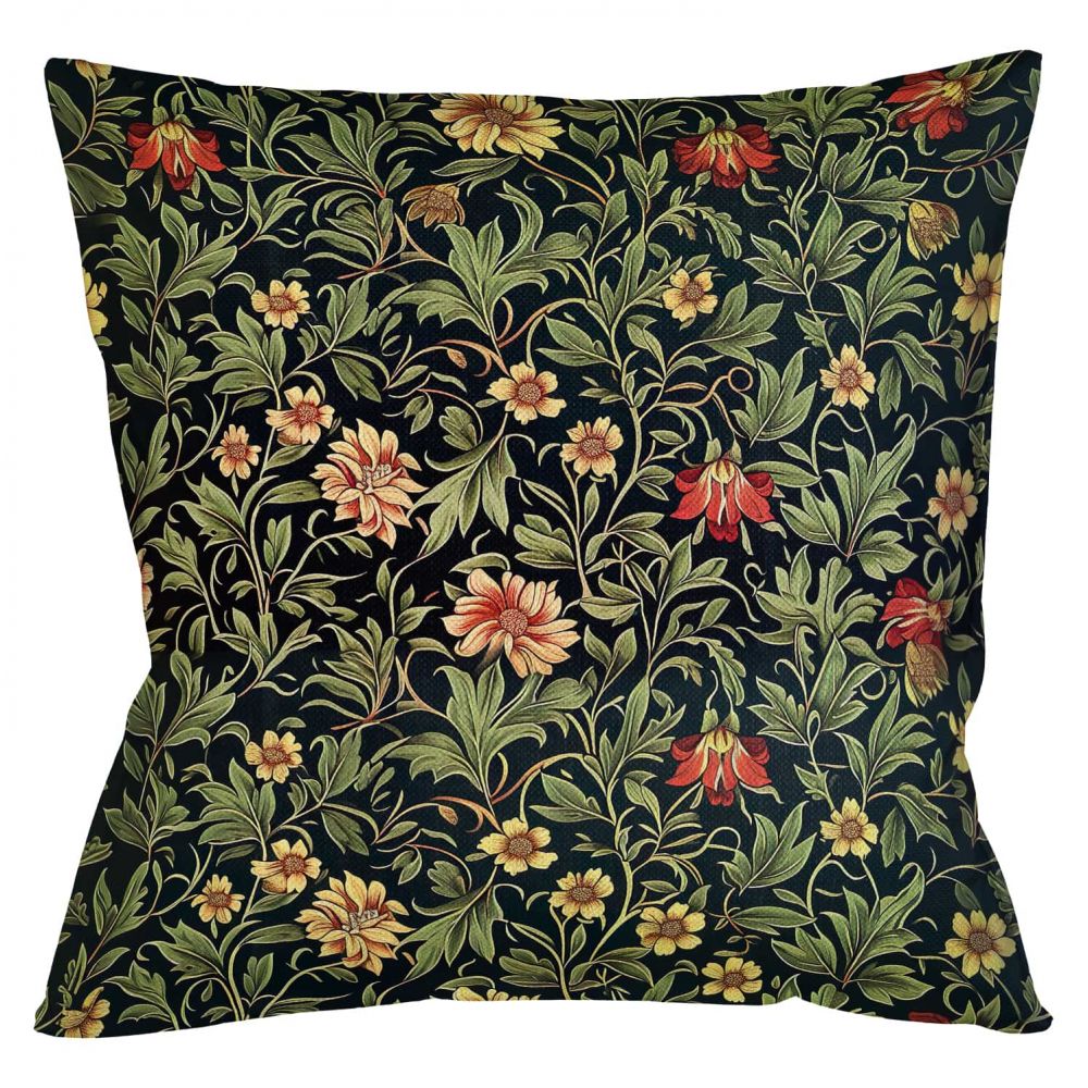 Обратная сторона подушки демонстрирует геометрический растительный орнамент, составленный из зеленых листьев, желтых и красных бутонов, что придает изделию элегантность и законченный вид.