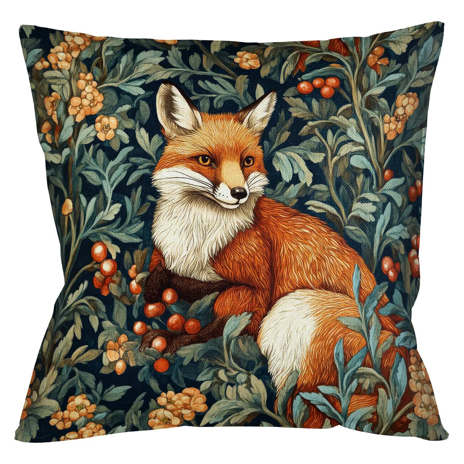 Главное украшение подушки – изображение лесной красавицы лисы, искусно вписанное в пышный фон из зеленых листьев, ярких цветов и сочных плодов. Эта композиция, выполненная в духе знаменитых гобеленов и обоев Уильяма Морриса, излучает гармонию и умиротворение. Лиса, изображенная с вниманием к деталям, привносит в дизайн подушки элемент волшебства и загадочности.
