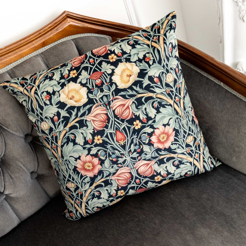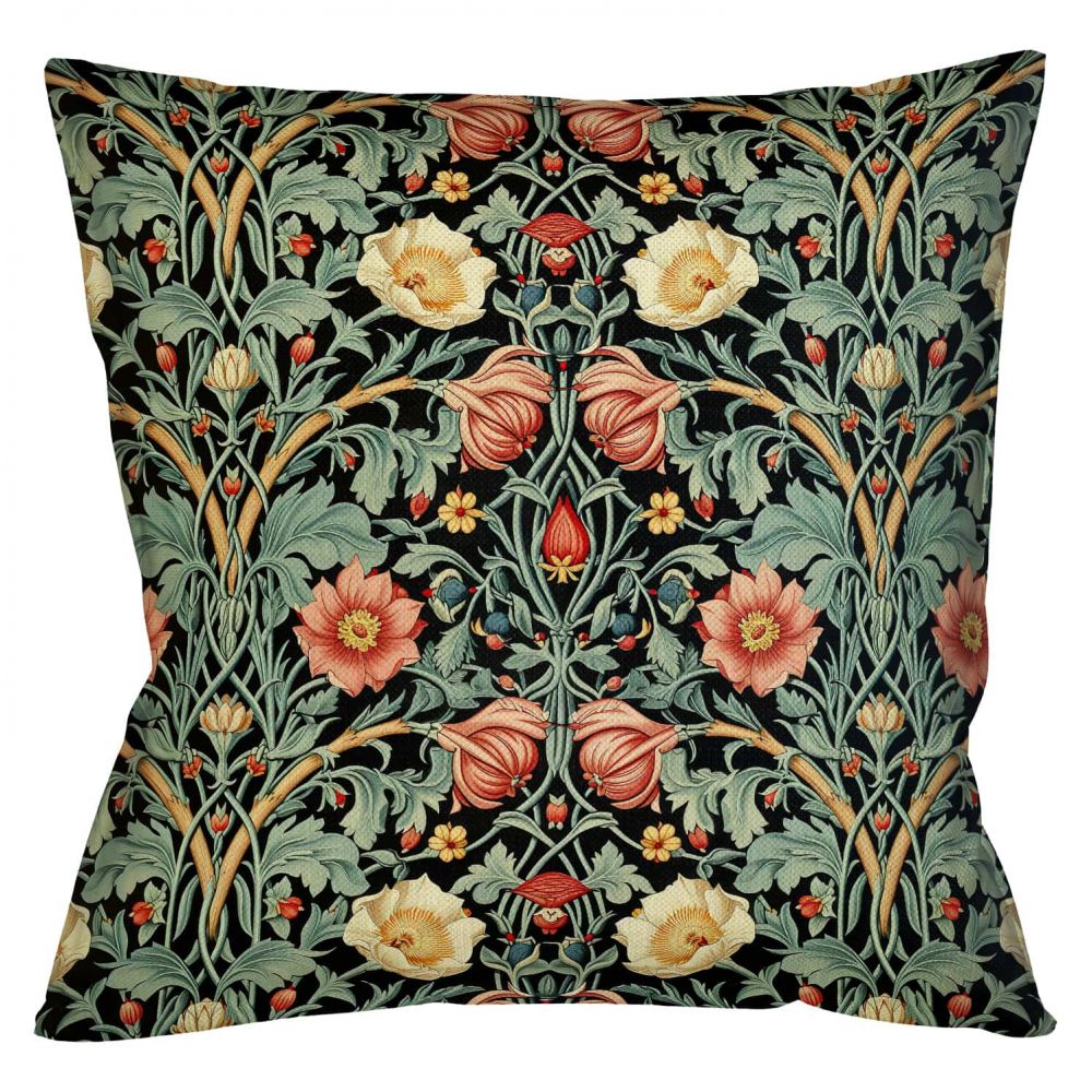 Оборотная сторона подушки не менее привлекательна. Она украшена строгим, но изящным геометрическим рисунком. Насыщенный черный фон служит идеальным фоном для переплетенных листьев, а также красных и желтых цветов, создающих динамичный и при этом сбалансированный визуальный эффект. Этот геометрический узор, вдохновленный орнаментами Уильяма Морриса, придает подушке современное звучание, позволяя ей гармонично вписаться в интерьер любого стиля.