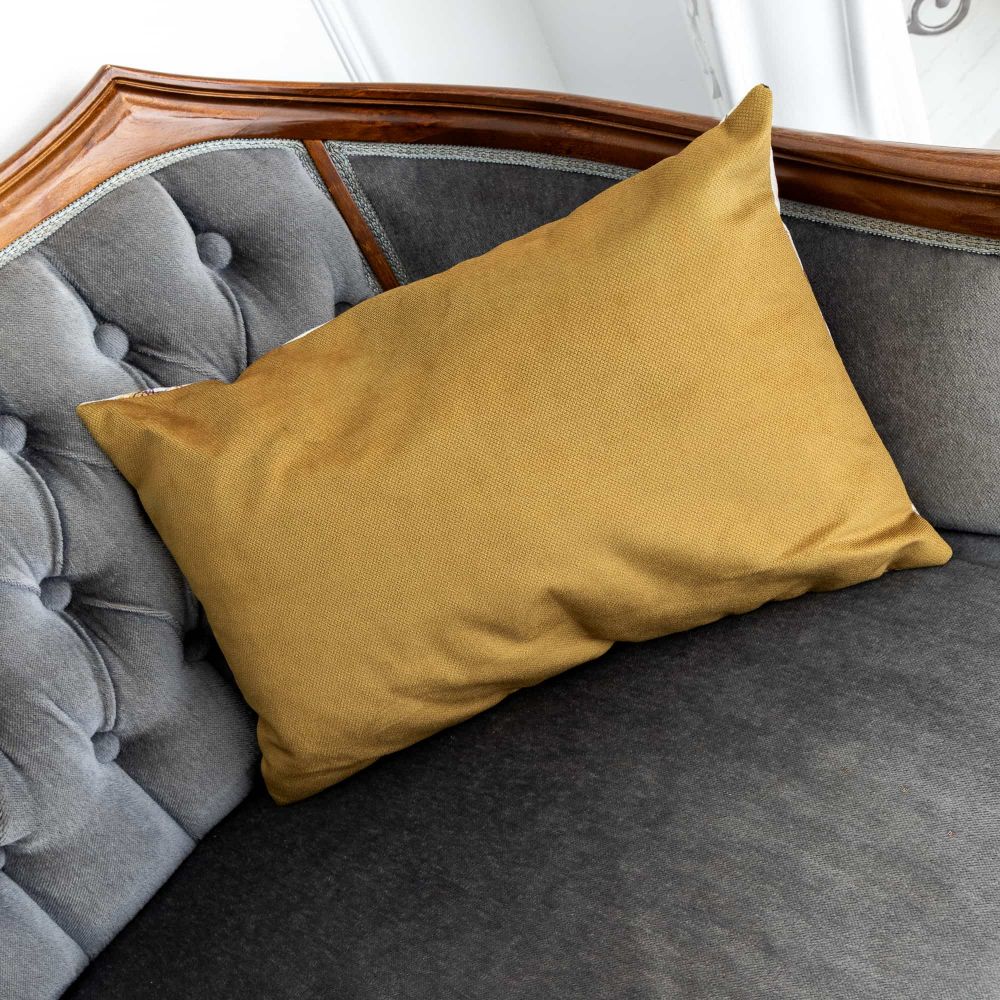Обратная сторона подушки выполнена в согревающем горчичном оттенке, который превосходно соответствует осенней концепции и привносит в интерьер ощущение тепла и комфорта.