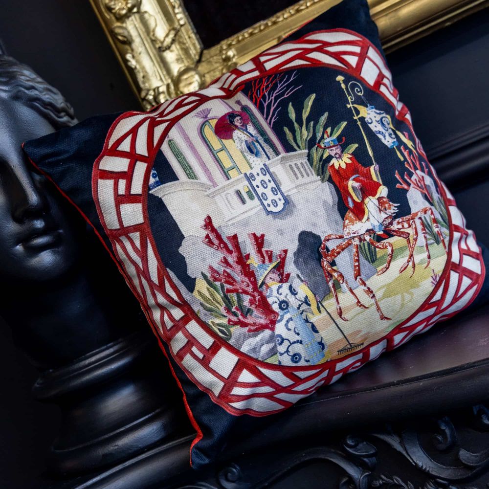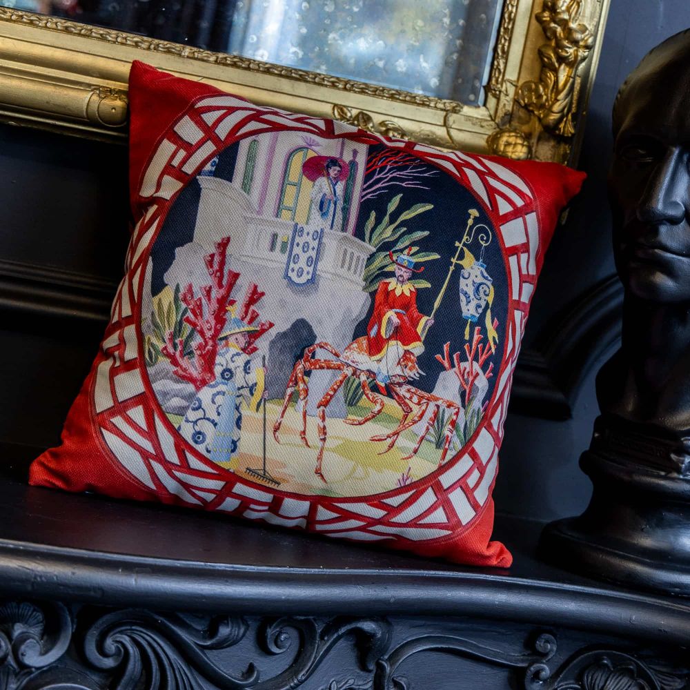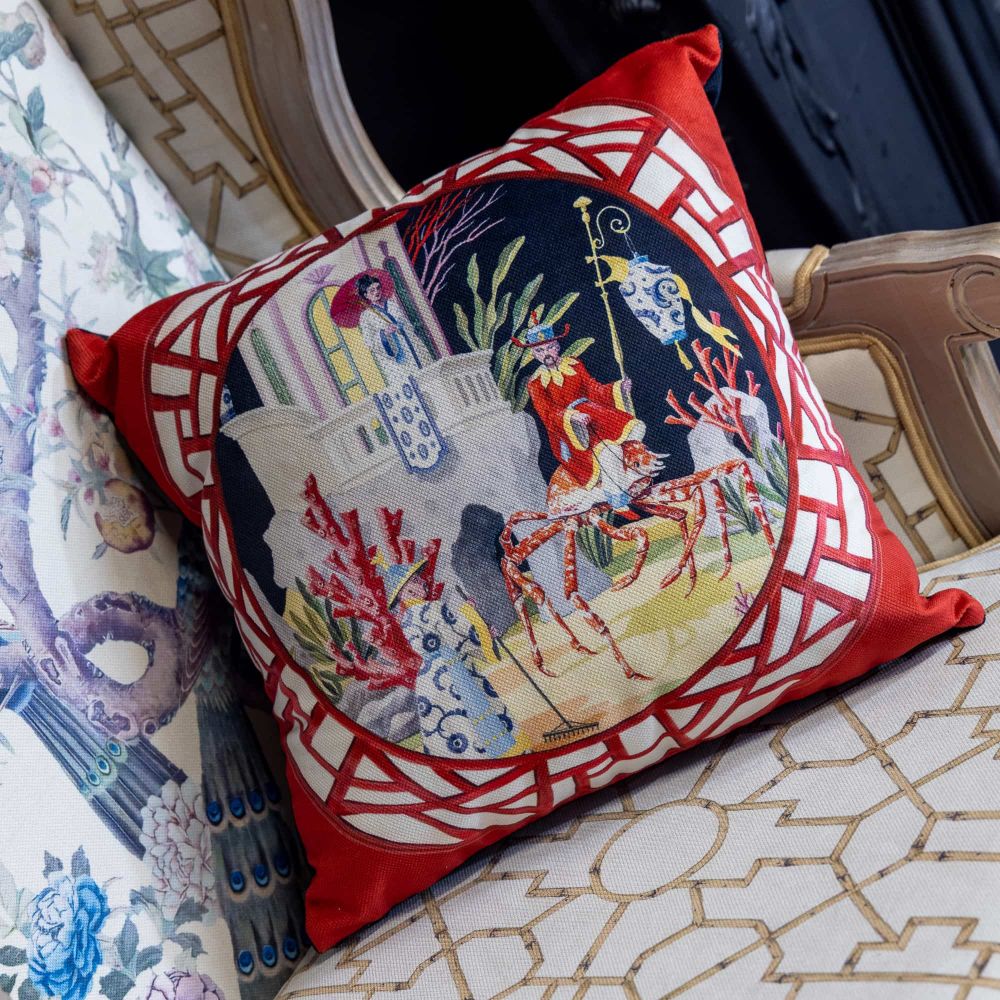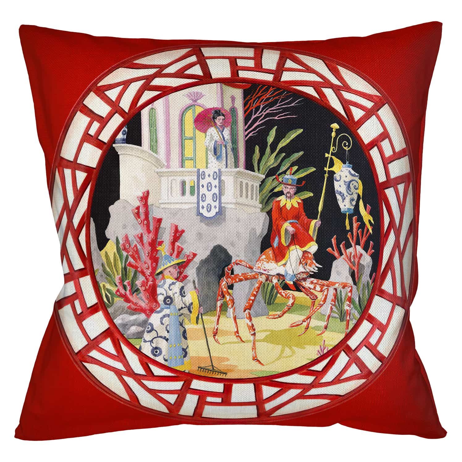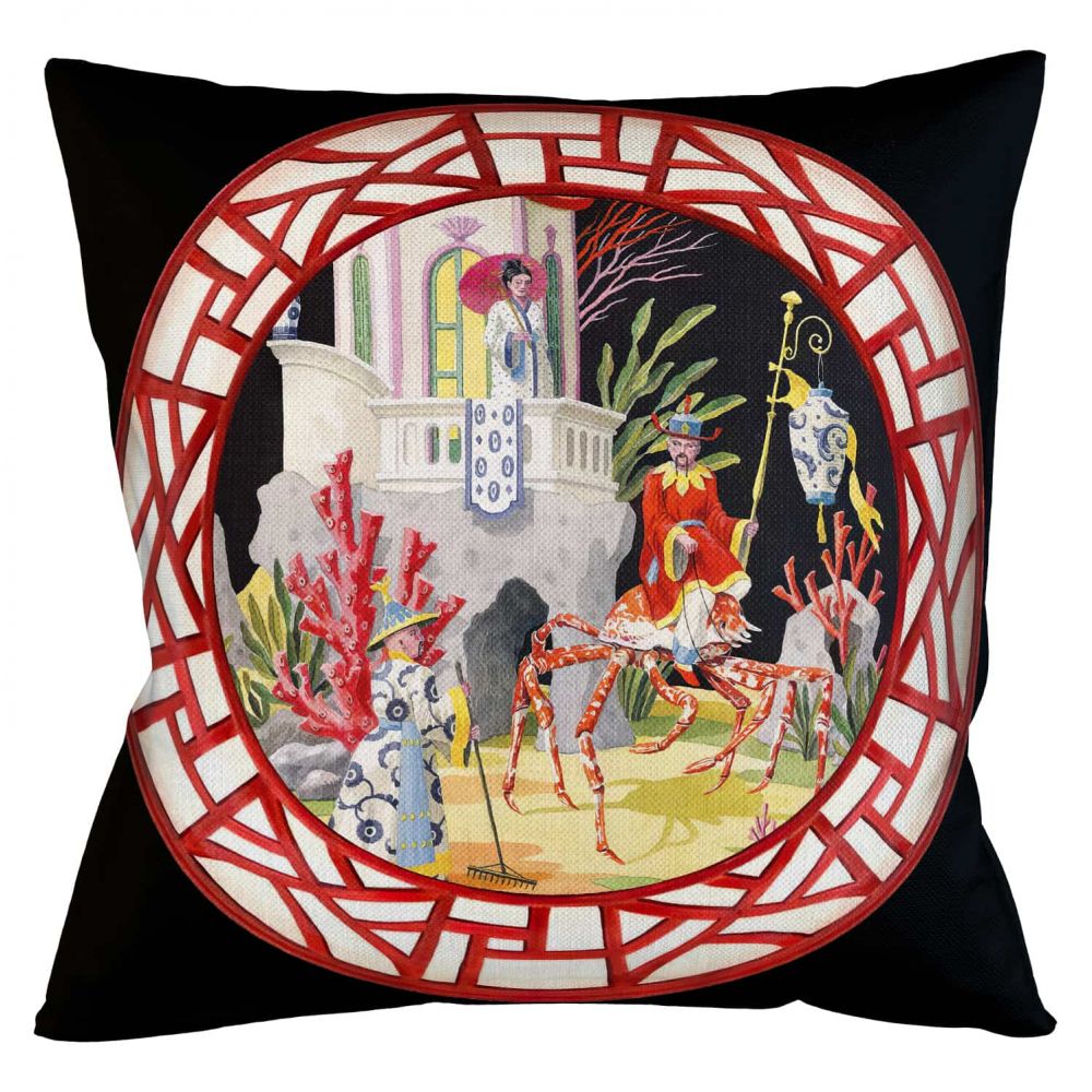 Подушка «Ориентали» – это не просто аксессуар, а законченное произведение искусства в стиле шинуазри. Она мгновенно очаровывает, погружая в атмосферу спокойствия и таинственной сказки о всаднике, путешествующем на гигантском крабе. Этот предмет становится ярким смысловым центром, который связывает классические мотивы и очарование Востока, привнося в любой интерьер утонченность, энергию и дух путешествий.