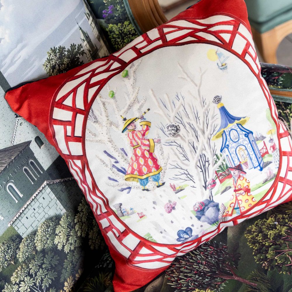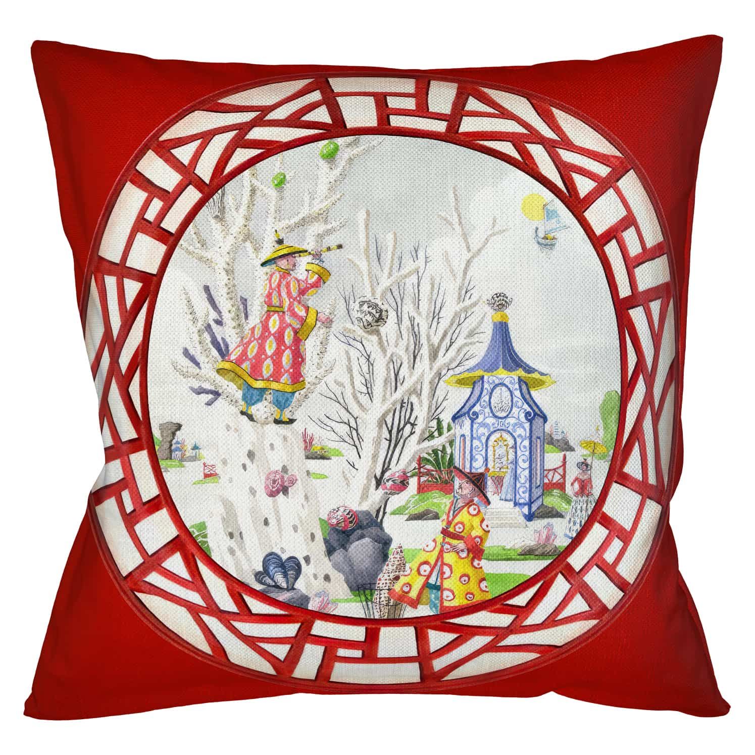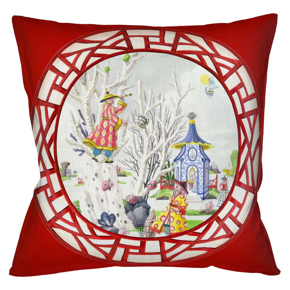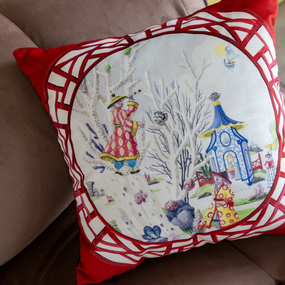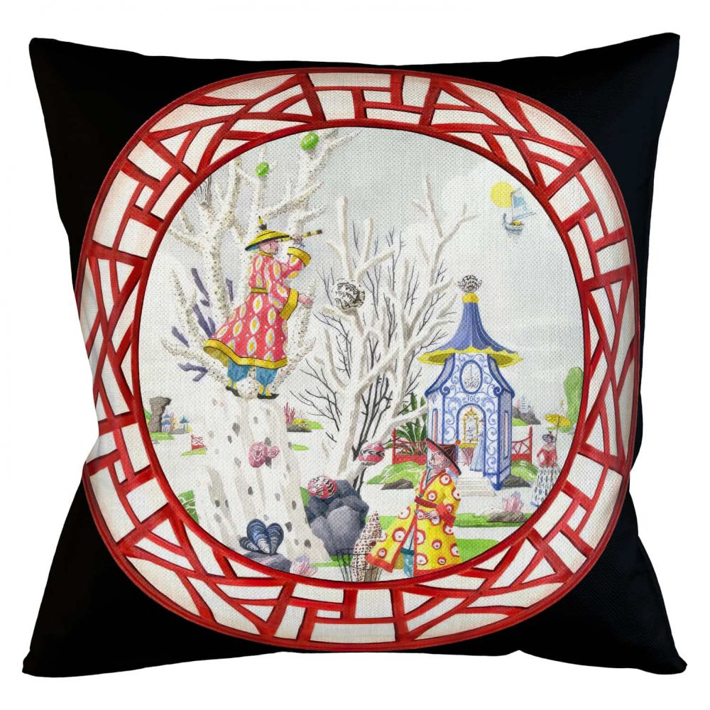 Стильный дизайн: Авторская роспись в актуальном стиле шинуазри делает подушку самостоятельным арт-объектом и ярким акцентом.