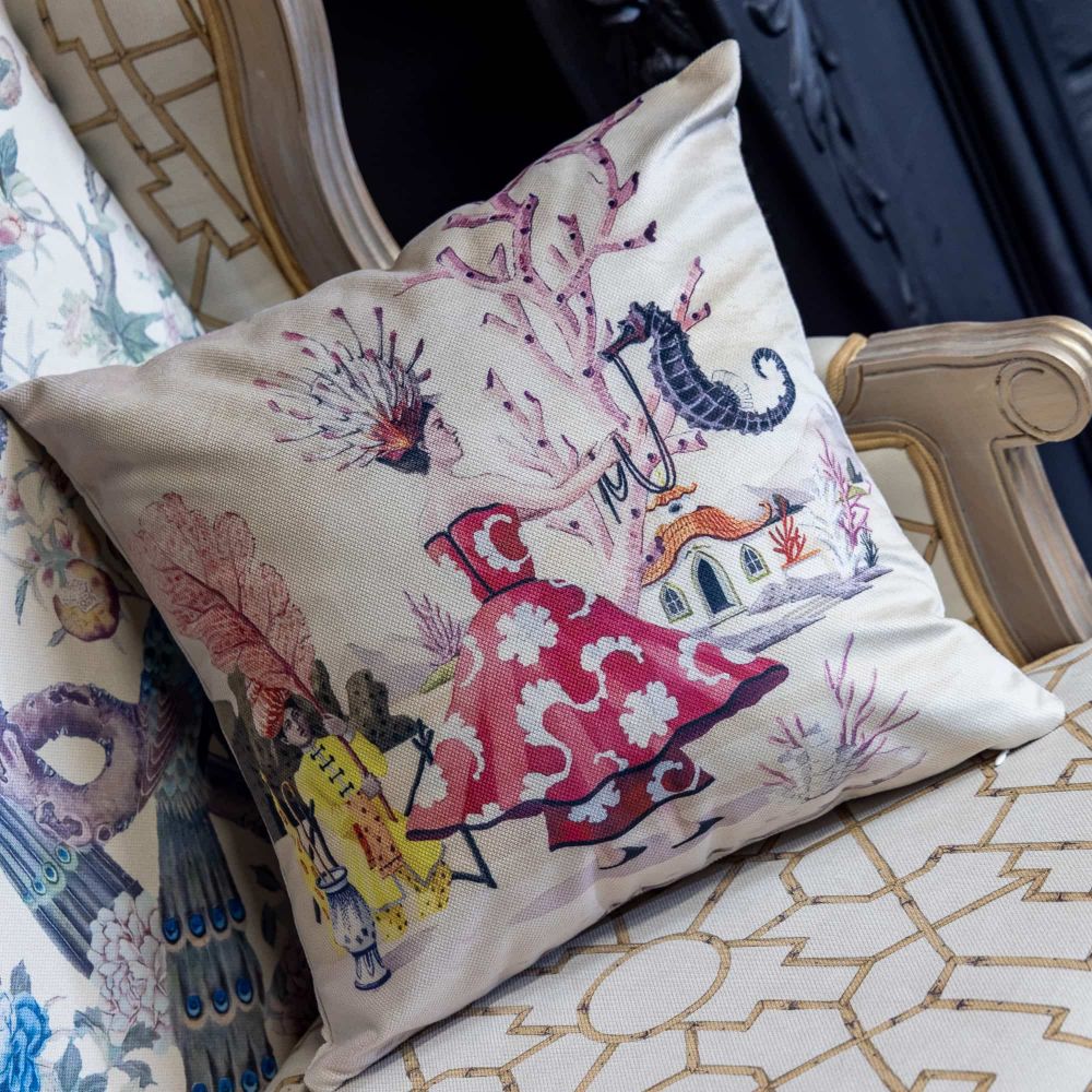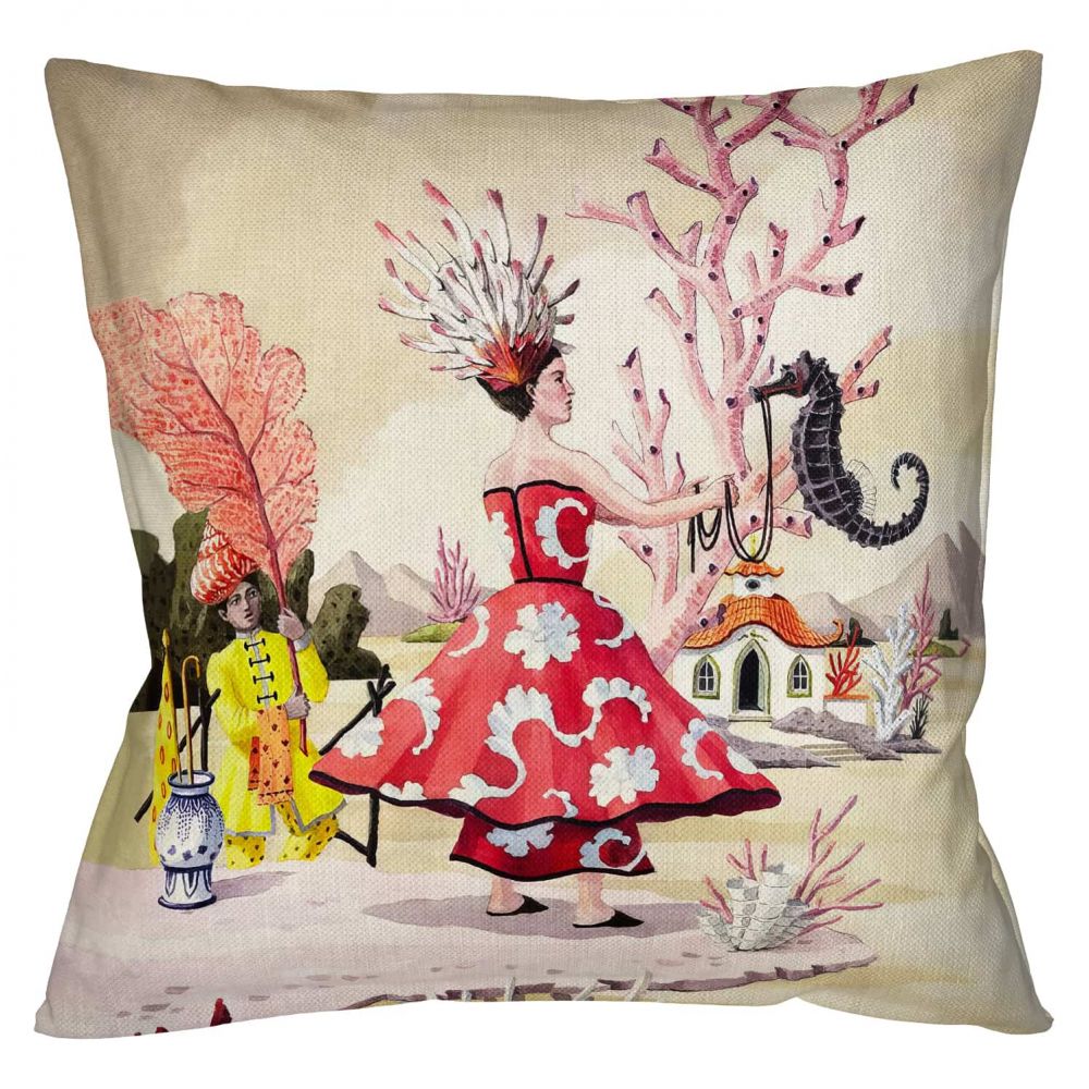 Какой удивительный сюжет разворачивается на этой подушке! Версия 13 коллекции «Мечты о Поднебесной» переносит вас из тихих садов в морские глубины — туда, где «морской конек мирно проплывает по воздуху». Это не просто орнамент, а целая история с любовью к морю и его обитателям: ракушкам, кораллам и прекрасной девушке с прической из живых кораллов. Утонченный стиль шинуазри, вдохновленный восточной эстетикой, делает ее настоящим произведением искусства для вашего дивана или кровати — предметом, который хочется рассматривать, изучая каждую деталь.