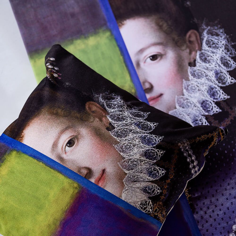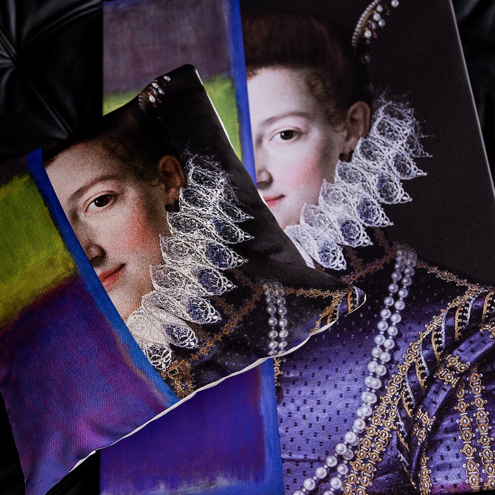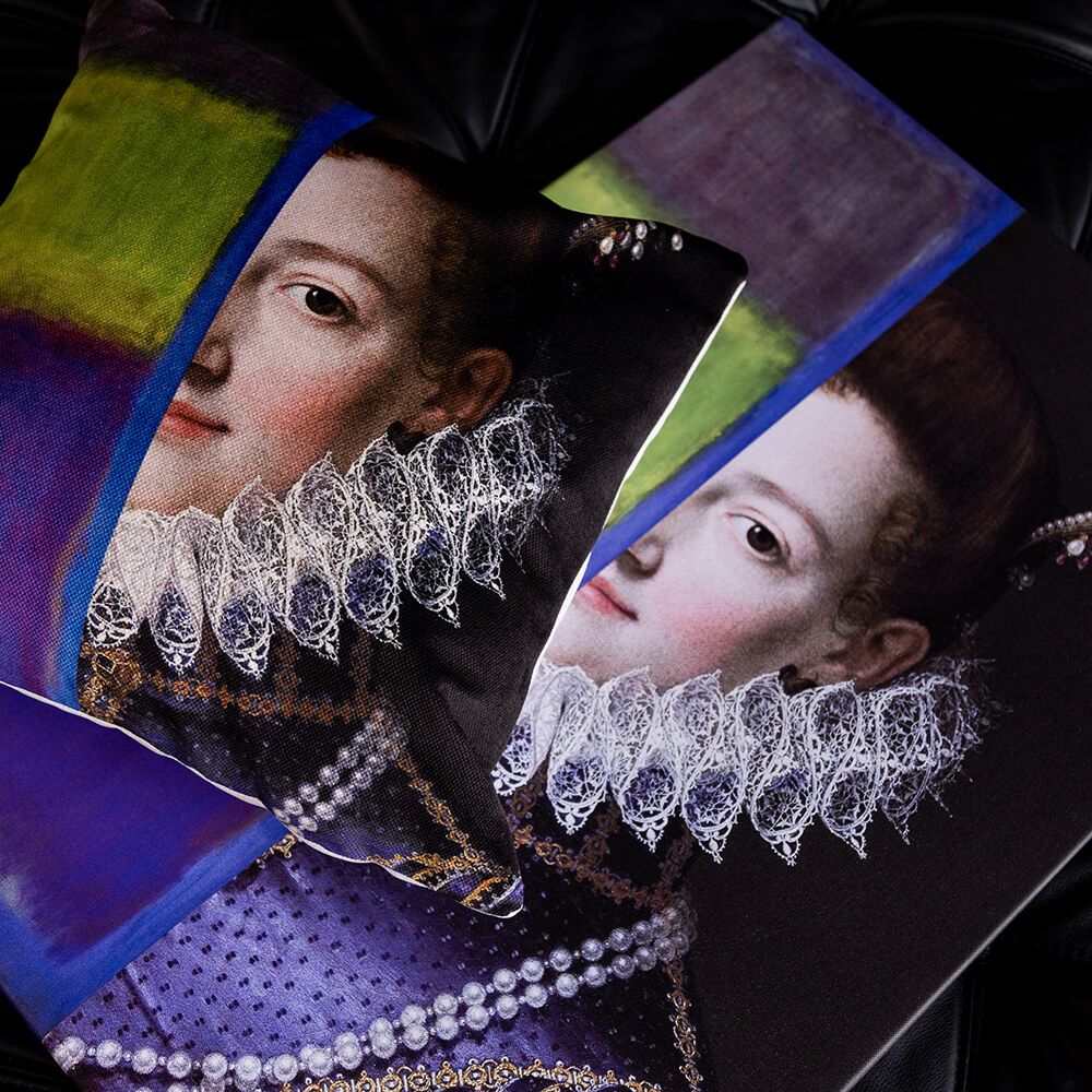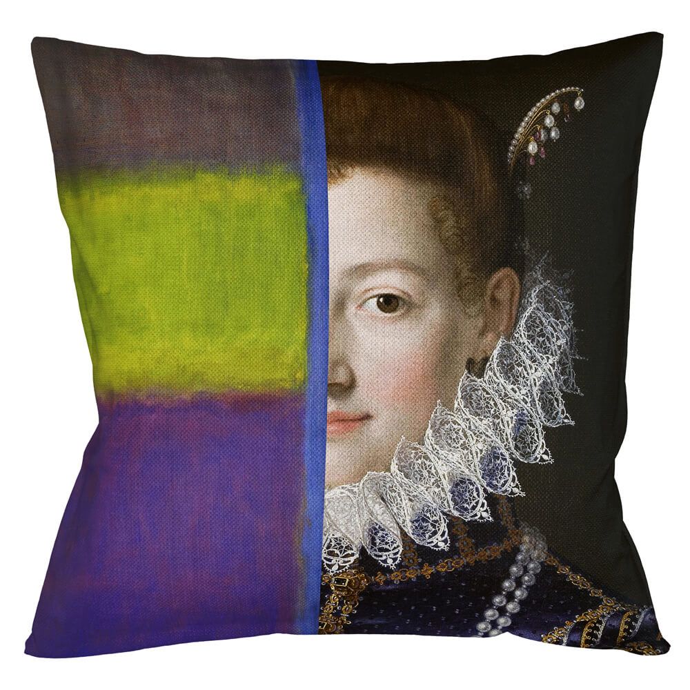 Это не просто декоративная подушка. Арт-подушка «Кристина» — это диалог эпох и художественных направлений, помещенный на ваш диван. В её основе — парадный портрет великой герцогини Тосканской Кристины Лотарингской, внучки Екатерины Медичи, созданный мастером позднего Ренессанса Шипьоне Пульцоне. Этот классический образ, олицетворяющий историю и могущество, соединен с элементами абстрактной живописи Марка Ротко, чьи работы оценивали не зрительно, а эмоционально. Такой союз рождает новый жанр: выразительный, загадочный и экстравагантный. Это идеальный акцент для гостиной, спальни или кабинета, который рассказывает историю и демонстрирует безупречный вкус владельца.