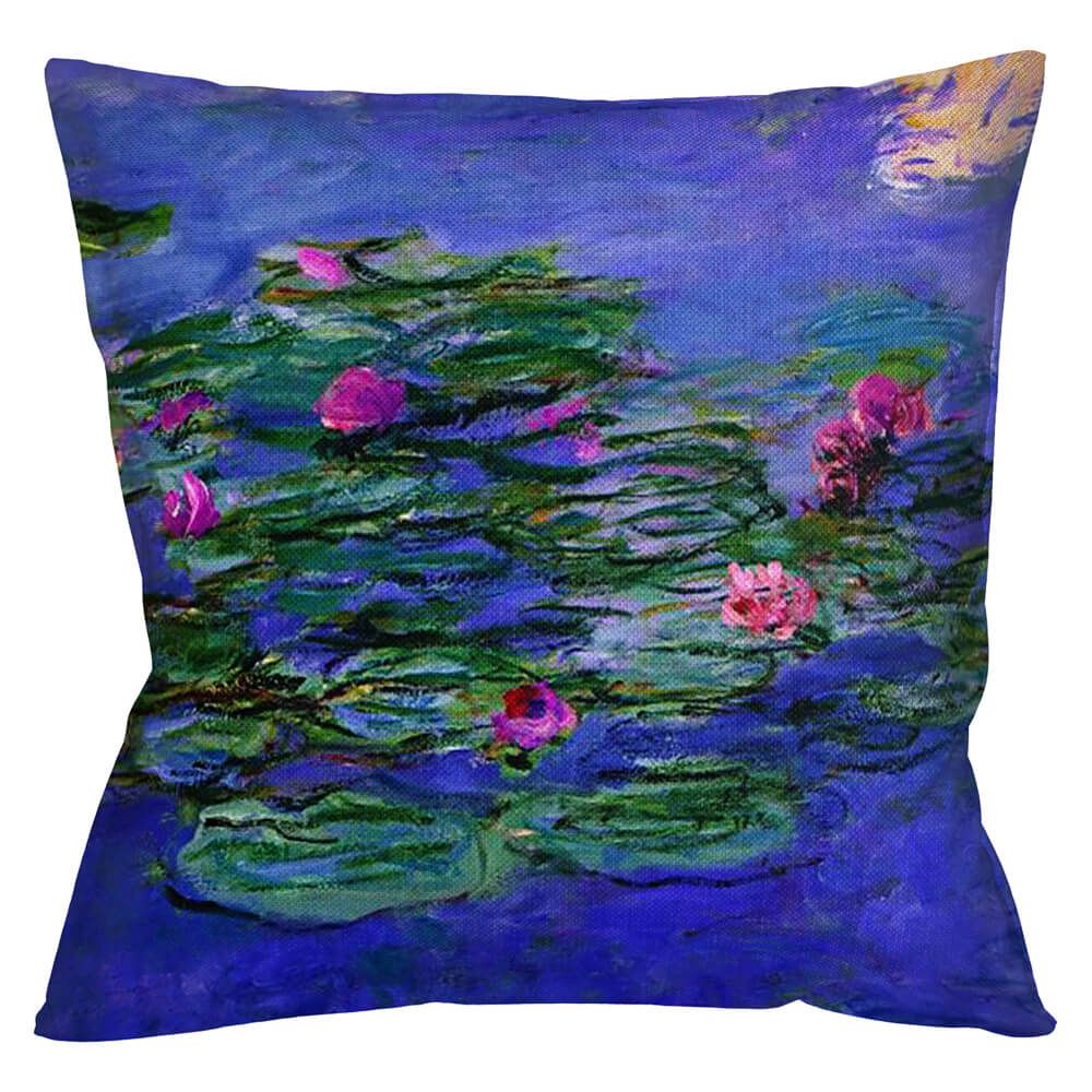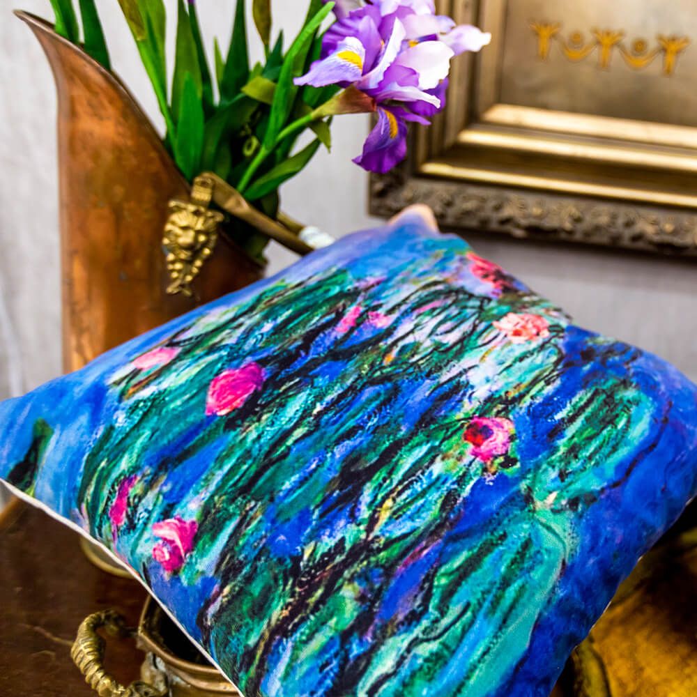 Дизайн с историей: Подушка «цитирует» картину «Красные водяные лилии», написанную Моне в 1919 году. Изображение передает удивительную прозрачность красок и «эффект акварели», достигнутый маслом, что делает рисунок по-настоящему уникальным.