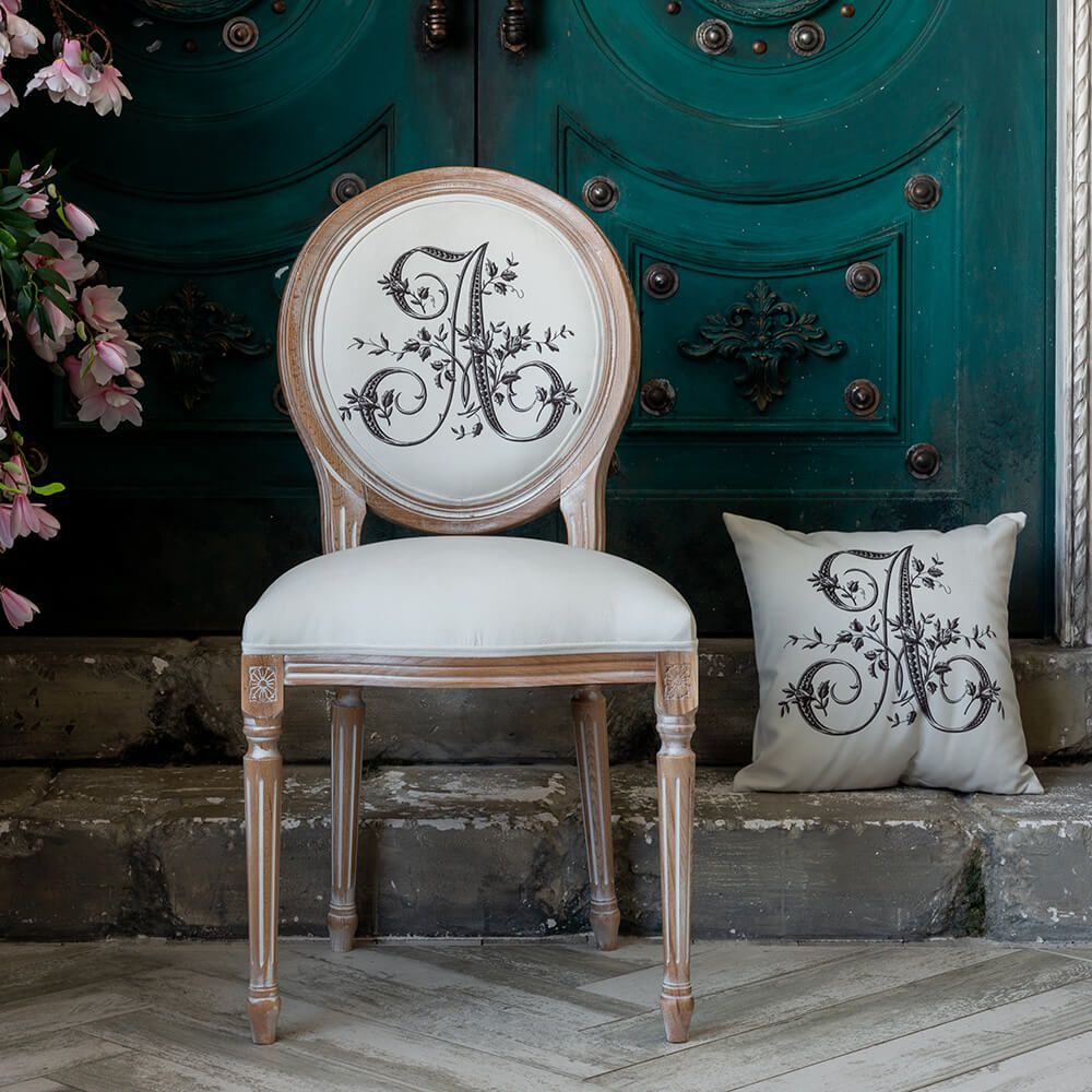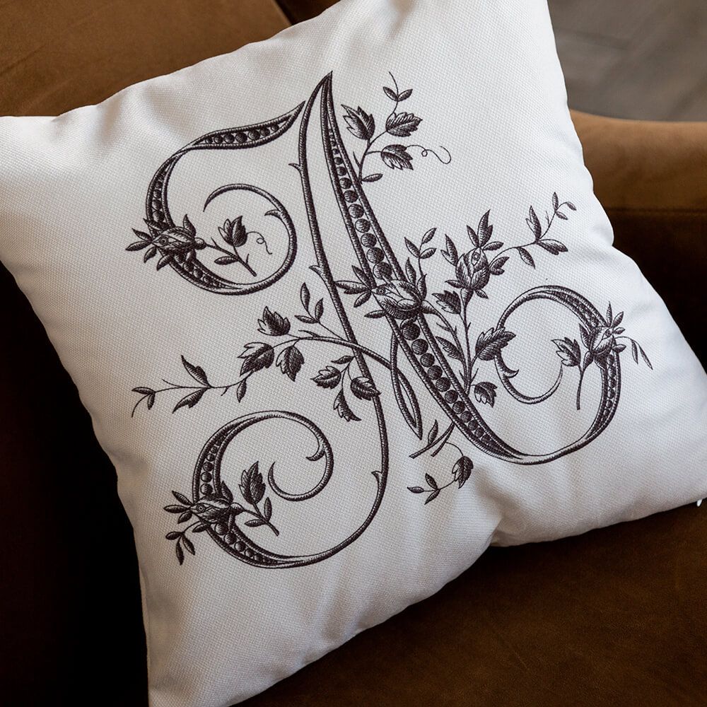 Представьте: инициалы вашего имени вдруг оживают на ткани. Линии букв то утолщаются, то утоньшаются, они переплетаются, изгибаются и закручиваются в причудливый узор. Этот танец букв застыл в идеальной монограмме, которая магическим образом притягивает взгляд и становится центром внимания в любой комнате.