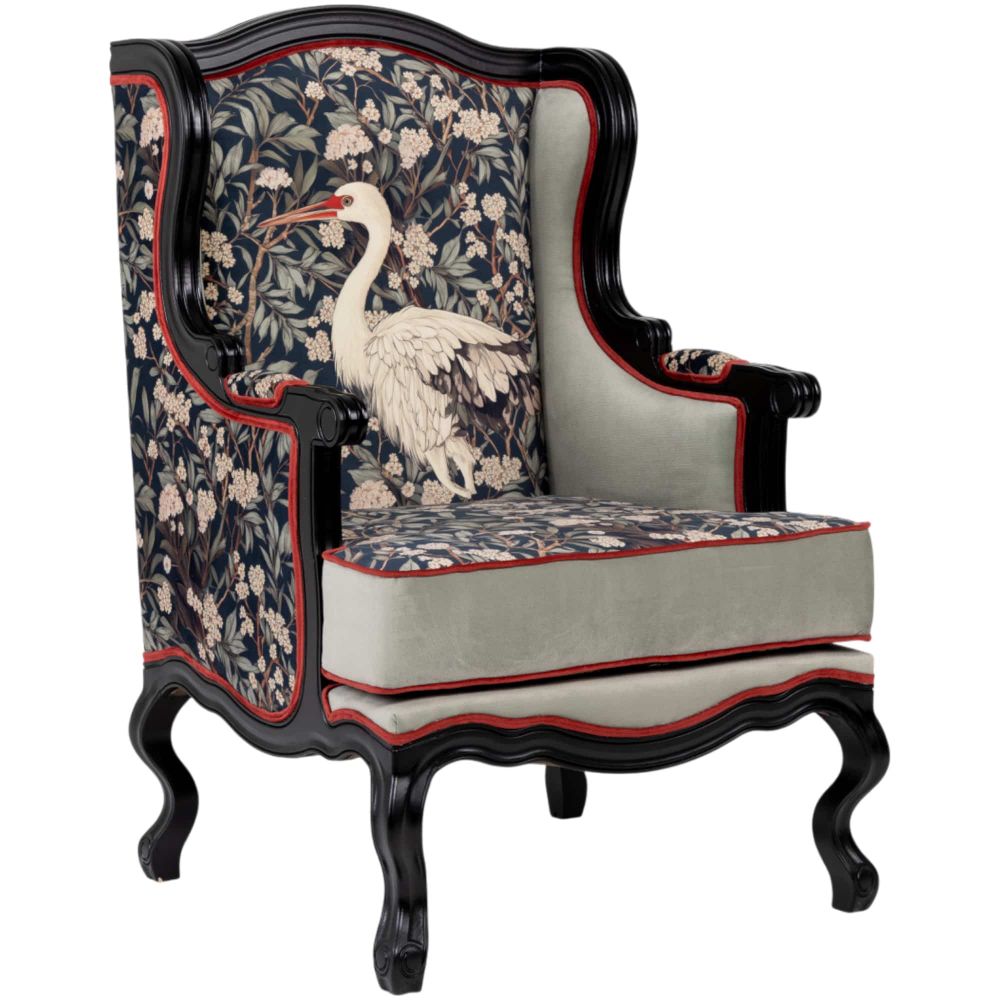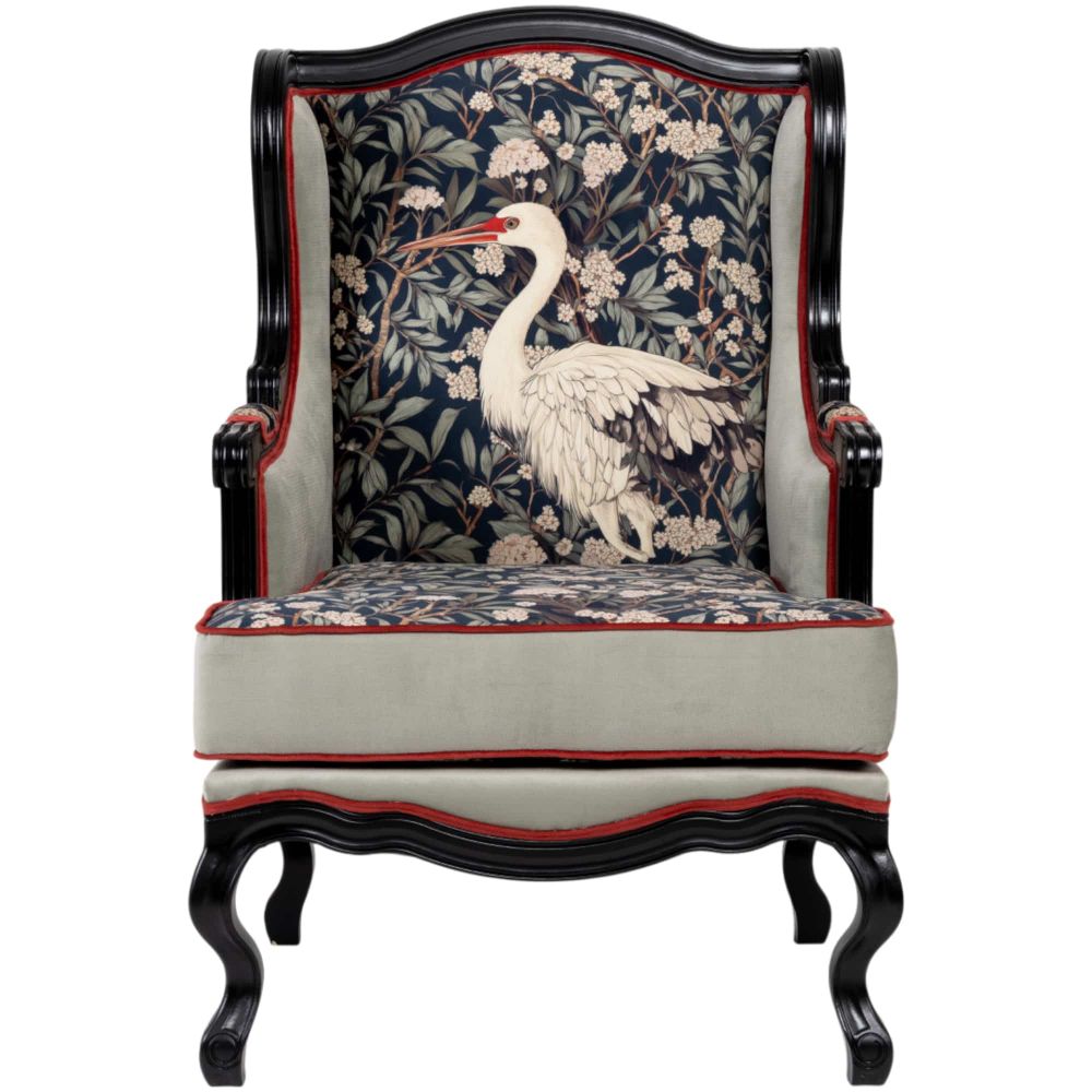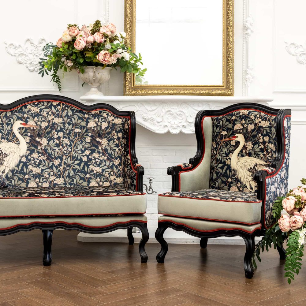 Глубокий черный фон сиденья и задней части кресла служит холстом для россыпи белых цветов и нежно-зеленой листвы. Спинка словно оживает под взглядом: на фоне нежных белых цветов расположилась белоснежная цапля с грациозной шеей и алым, словно рубин, клювом.