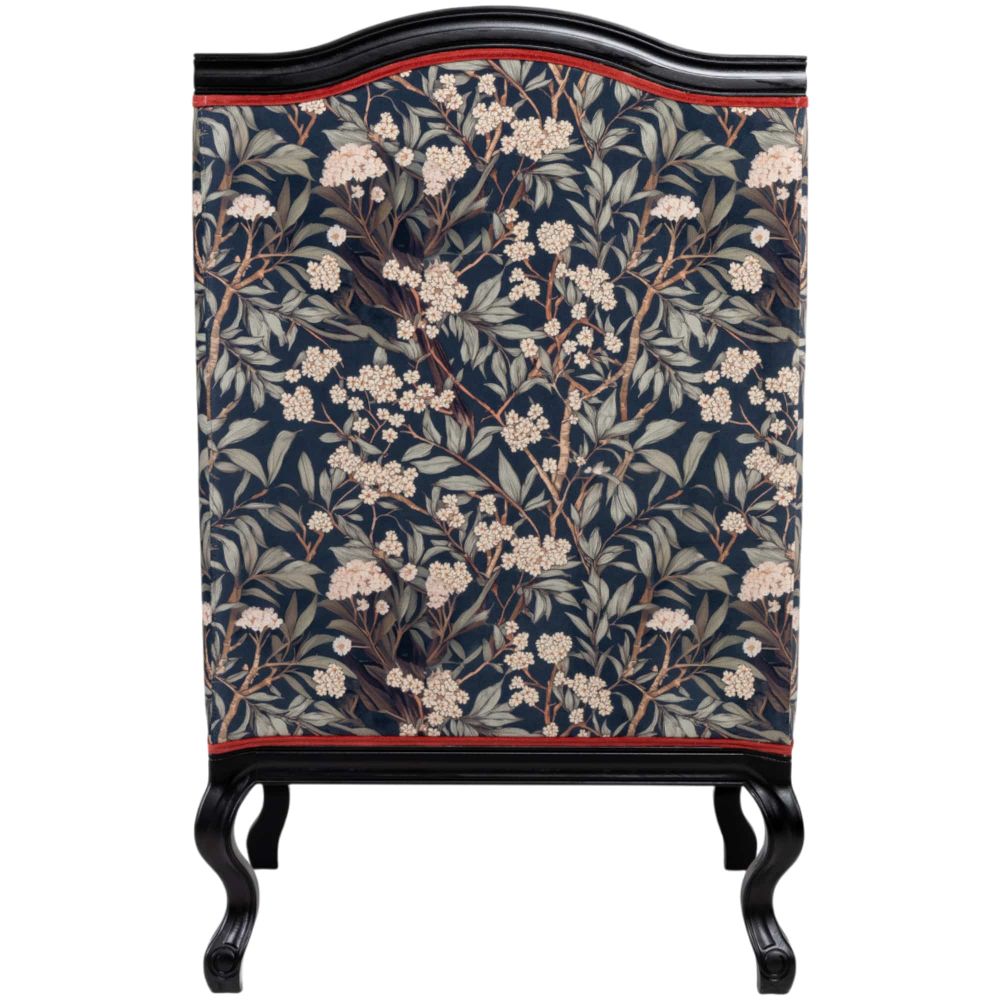 Изысканность креслу придает сочетание глубокого черного фона с нежным рисунком белых цветов, создающим атмосферу таинственности и умиротворения. Зеленые листья, рассыпанные по черному полю, добавляют ощущение свежести и природной гармонии. Алая окантовка подчеркивает формы кресла, делая его силуэт более выразительным и запоминающимся.