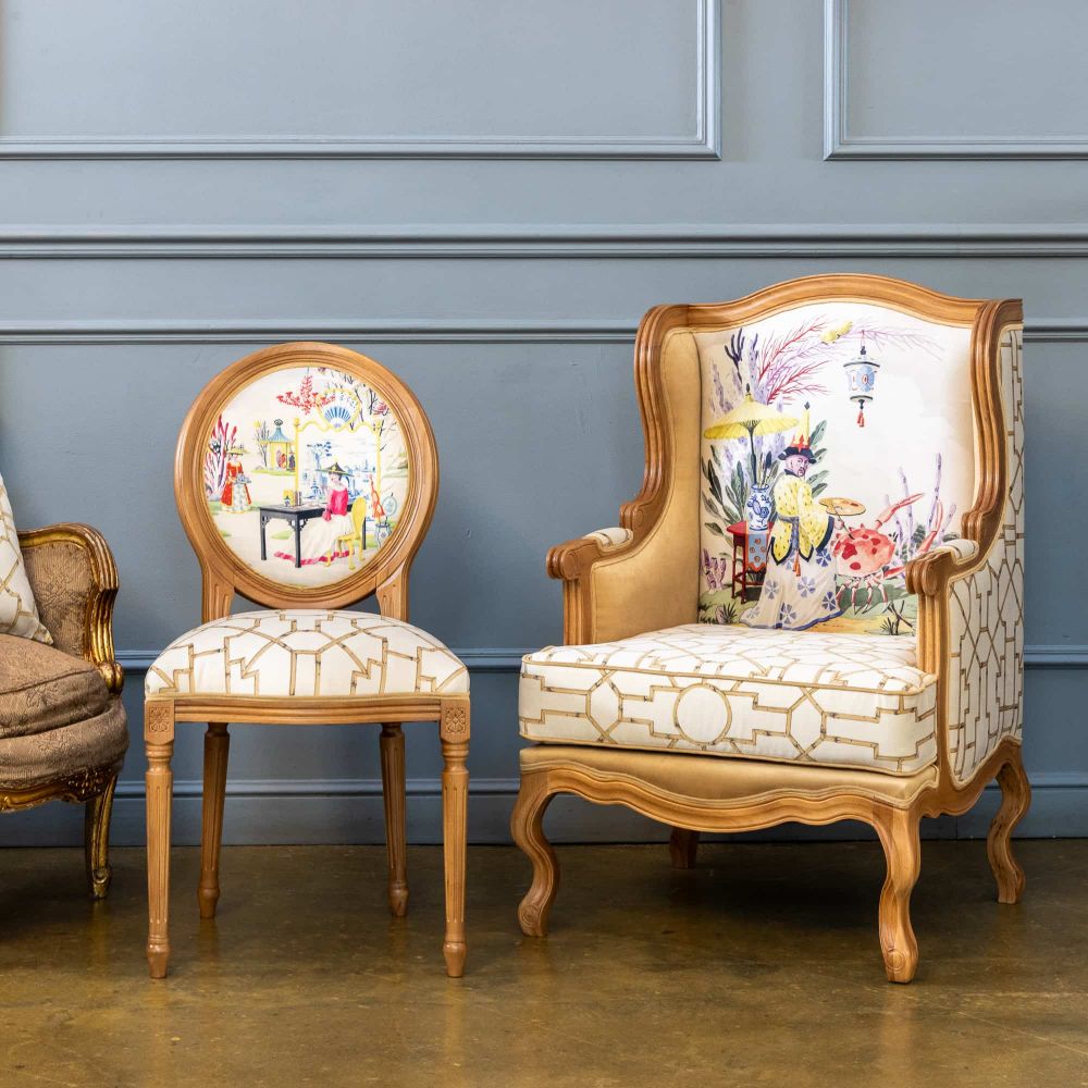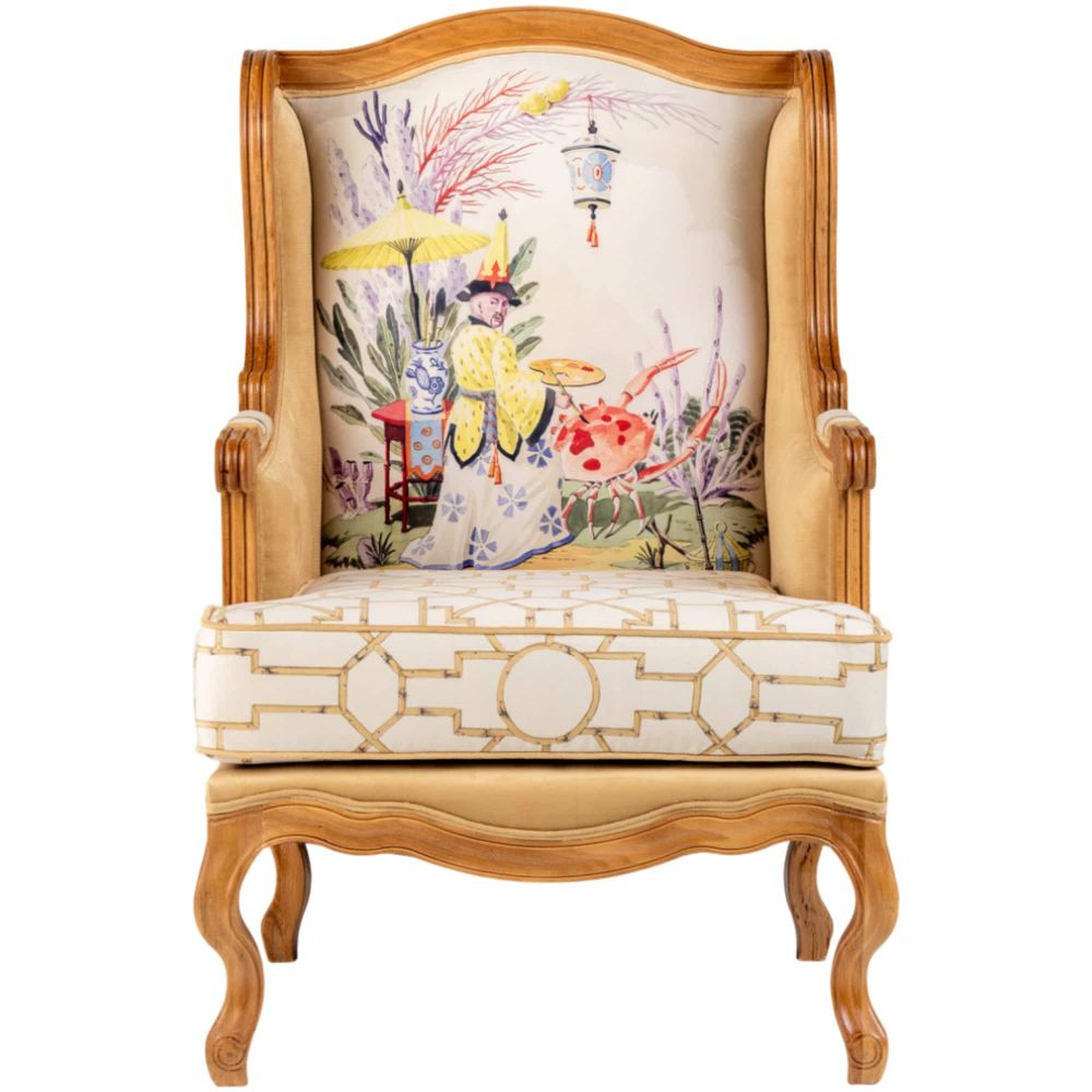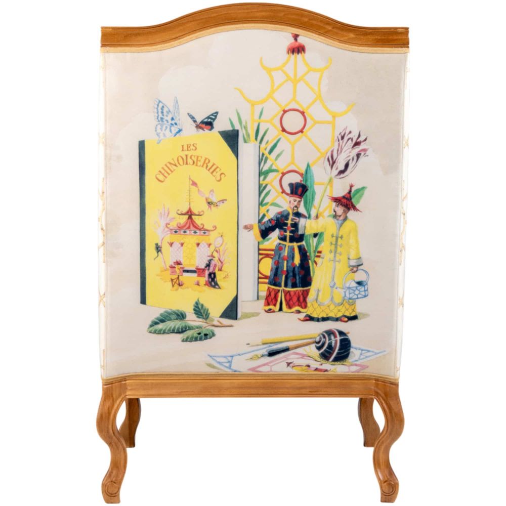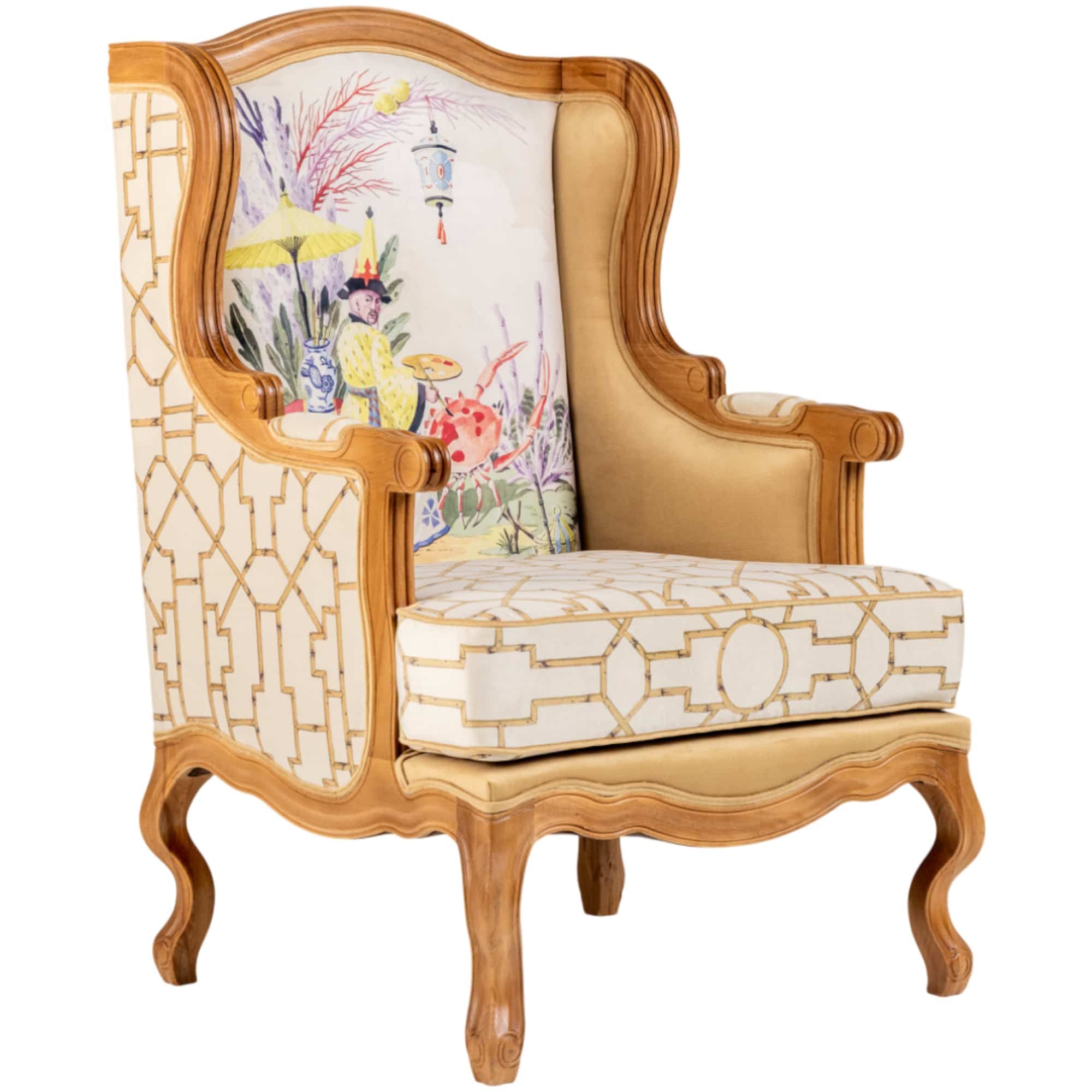 Кресло «Мечты о Поднебесной» — это больше, чем предмет мебели. Это путешествие в сказочный мир, где искусство и быт сливаются воедино. Его центральный сюжет — талантливый художник, расписывающий драгоценного краба под облачным небом, — это не просто рисунок, а повествование о красоте и дарах моря. Надпись «Les Chinoiseries» на спинке погружает вас в очаровательный мир стиля шинуазри, где восточная фантазия встречается с европейским вкусом . Каждая деталь, от сюжета на спинке до орнамента бамбука на обивке, создана, чтобы превратить обычный интерьер в пространство, наполненное уютом, элегантностью и художественной утончённостью .