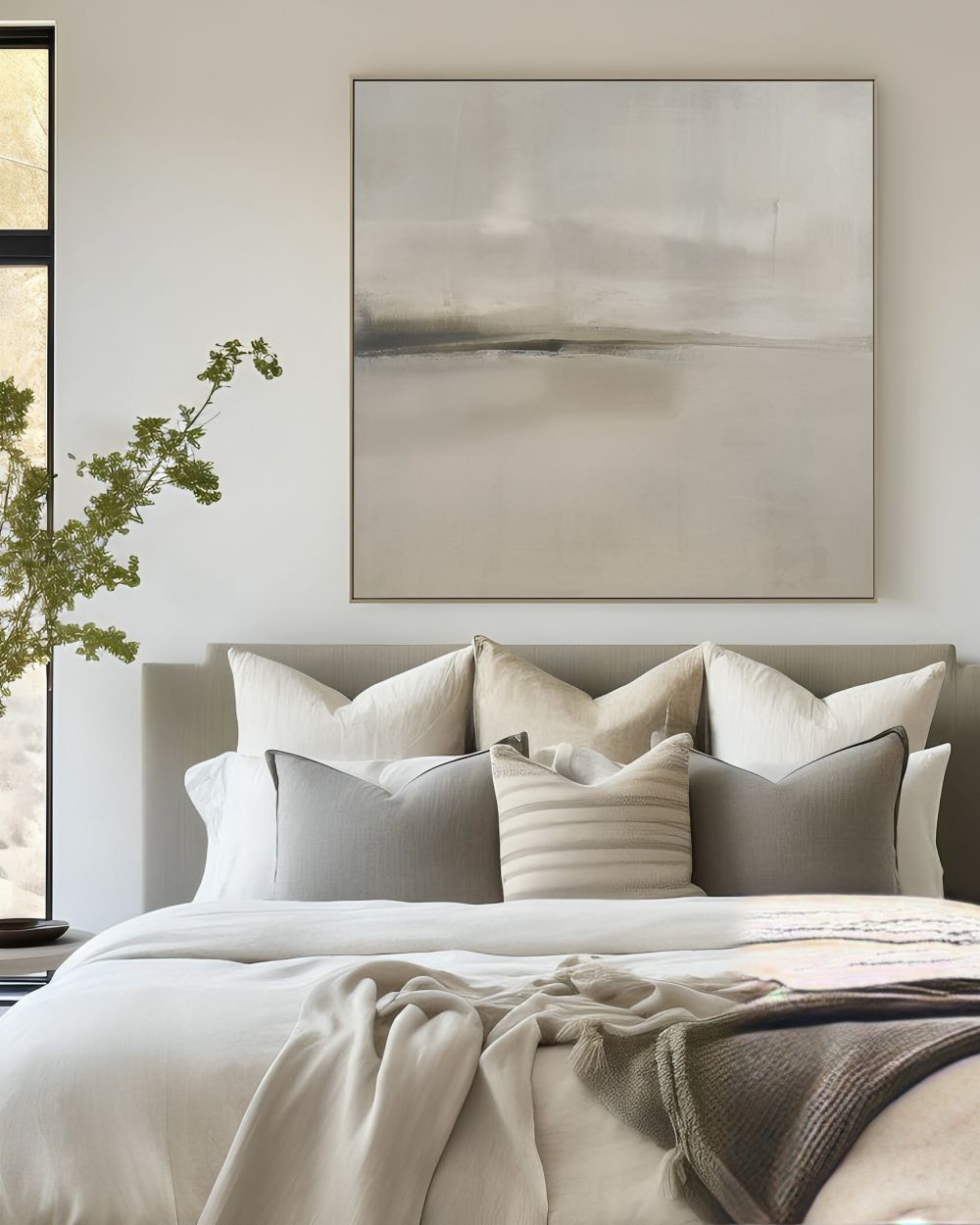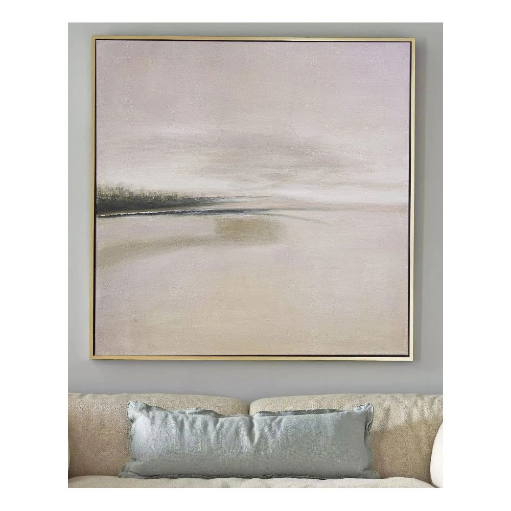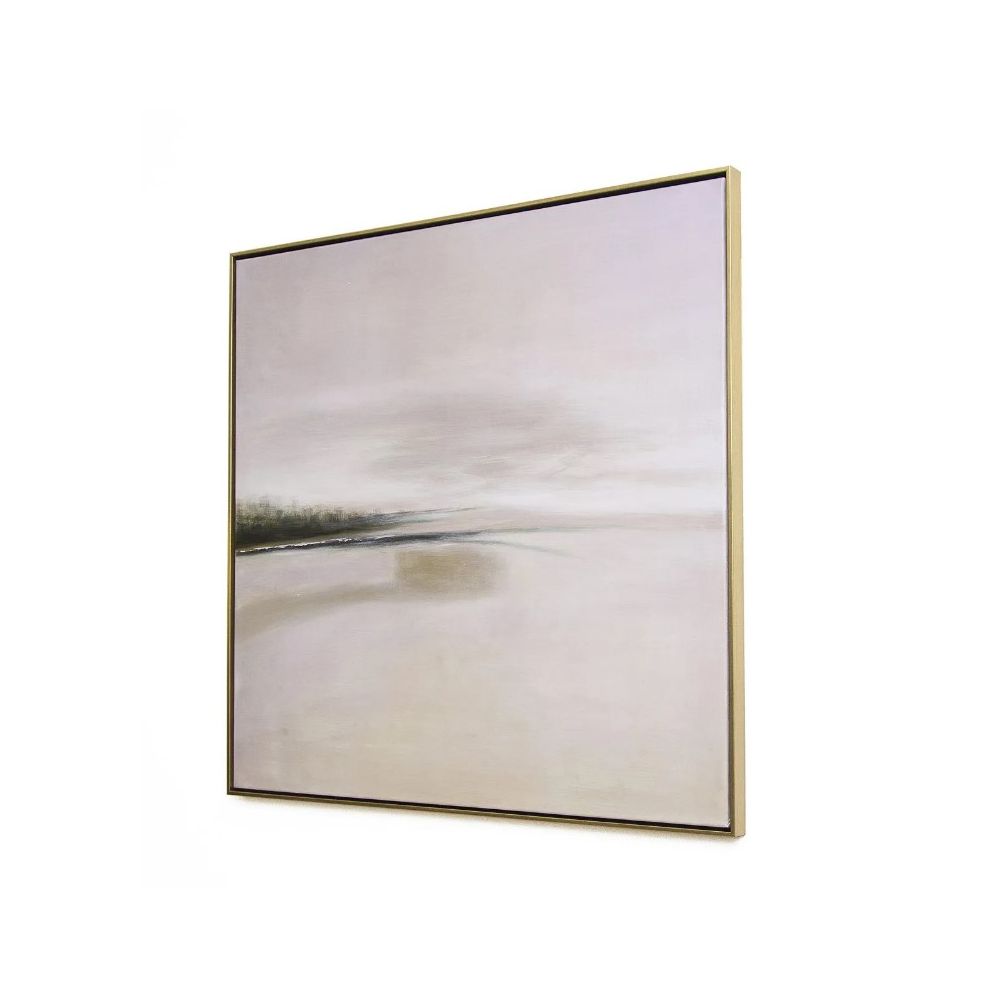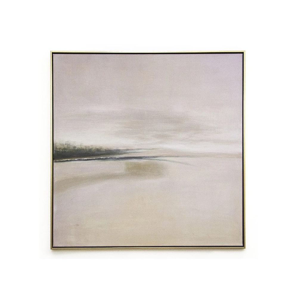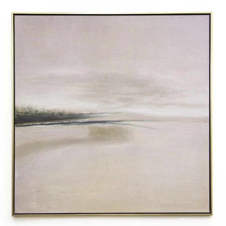 Картина с золотистой рамой “Дюнкер” – это абстрактное или минималистическое пейзажное произведение с мягкой, приглушенной цветовой палитрой. На ней изображена туманная, размытой сцена, побережье или озеро с отражением неба на воде. Картина передает спокойствие и умиротворение, использует размытые границы и нейтральные тона (бежевые, серые, приглушенные коричневые). Линия горизонта создает ощущение простора и бесконечности. Работа относится к современному искусству, выполнена в технике акриловой живописи на холсте. Отлично подойдет для интерьерных решений в стиле минимализм или скандинавского дизайна, который подчеркивает естественность и сдержанность.