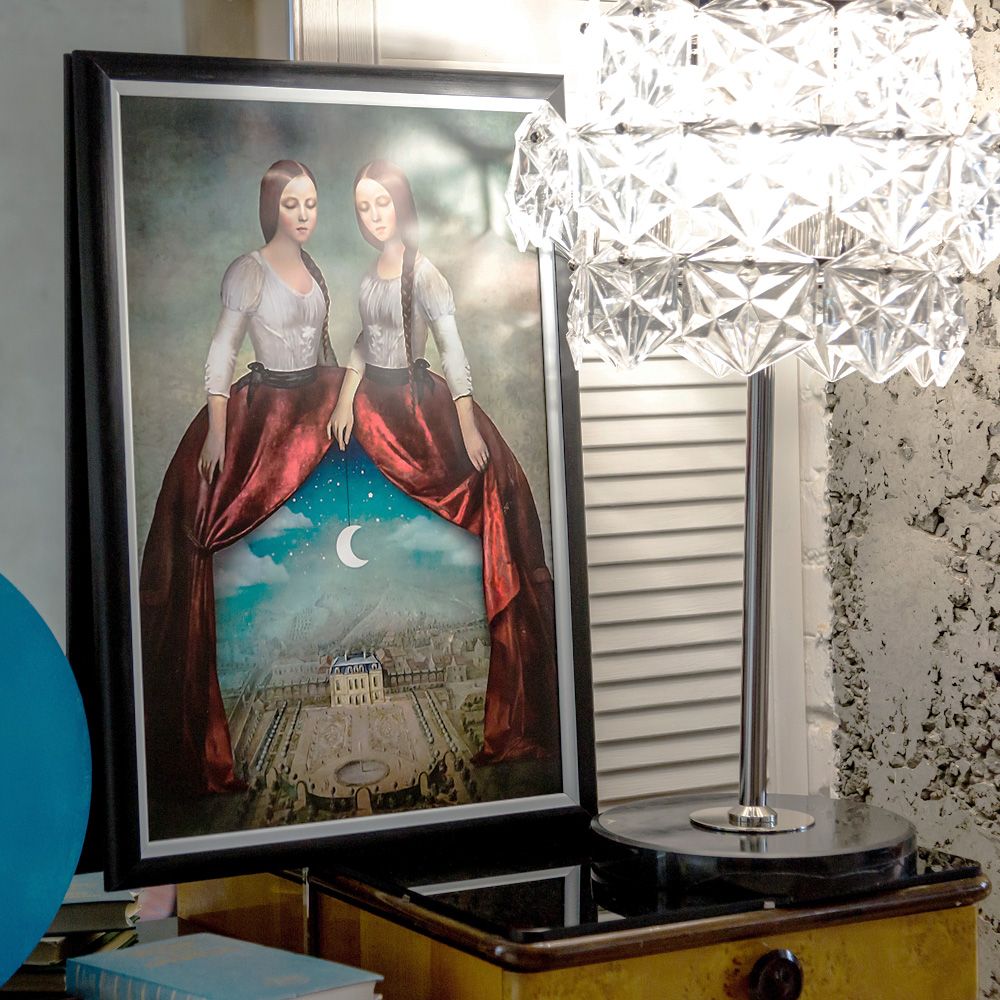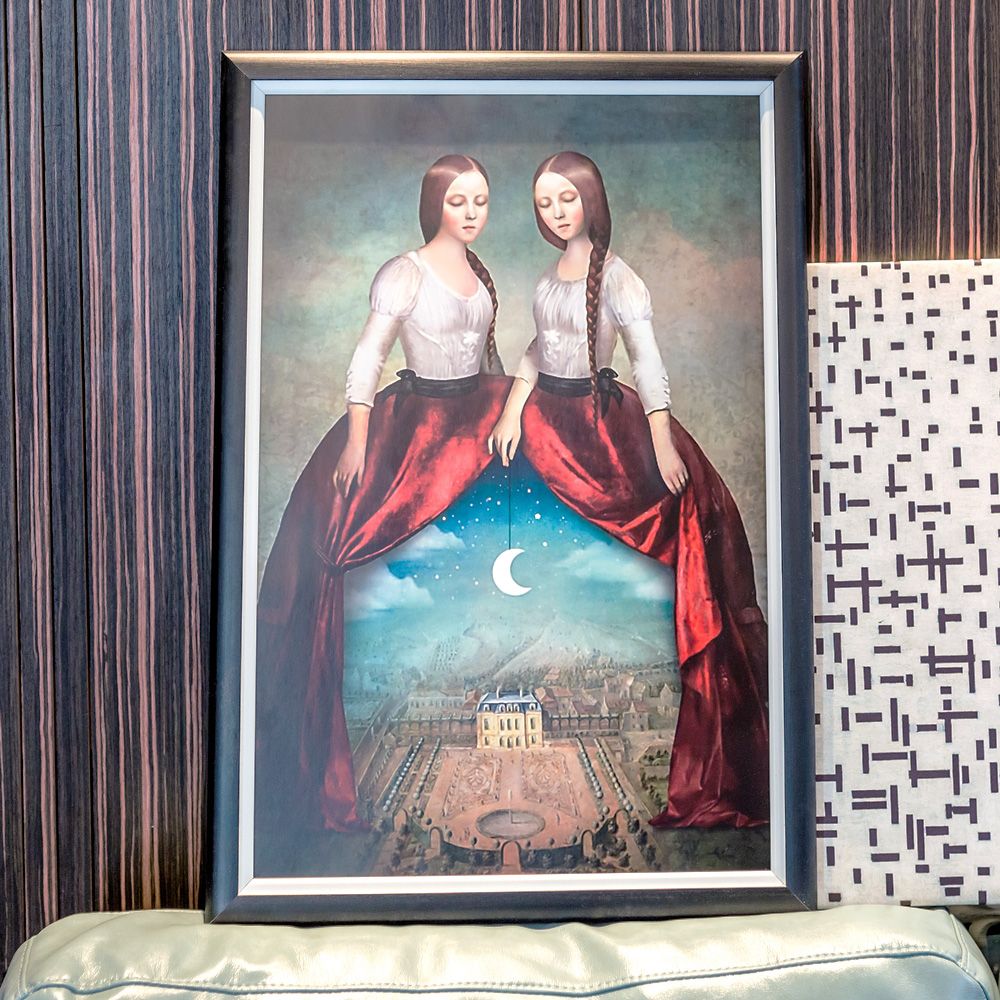 Строгая грациозная рама выигрышно подчеркнет яркие палитры сюрреализма, богатого цветовой энергией и забавной интгригой, столь желанными нашей повседневной домашней атмосфере. Классический цвет рамы составит безупречную гармонию прочим дизайнерским аксессуарам.
