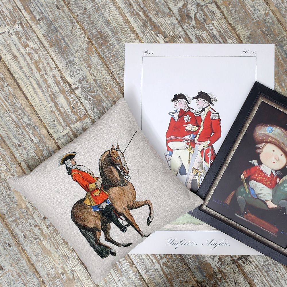Репродукция "Английская униформа" - афиша ретро-коллекции, включившей мягкие стулья и декоративные подушки, повторяющие приключенческие сюжеты исторических картин. Процитировав изображения на нескольких предметах, добиваемся авторского интерьерного эффекта, будто бы созданного художником по нашему персональному заказу.