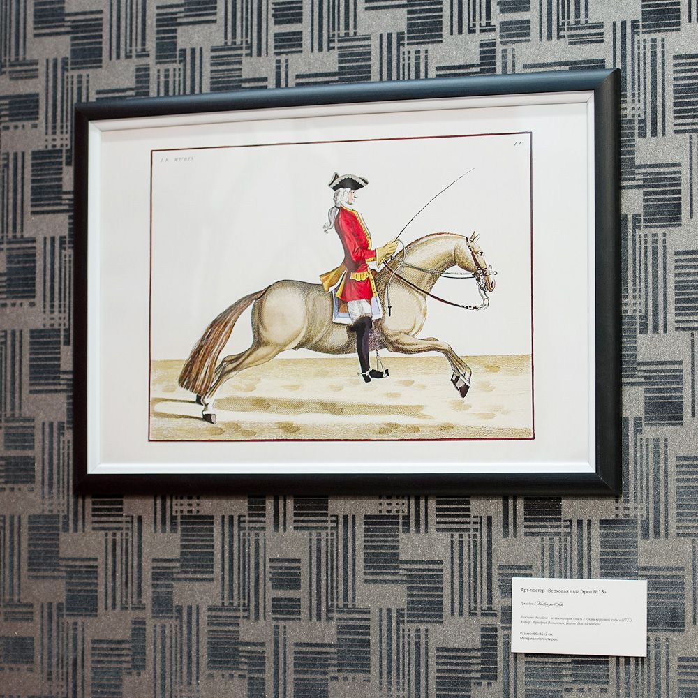 Репродукция "Верховая езда" - афиша ретро-коллекции, включившей мягкие стулья и декоративные подушки, повторяющие приключенческие сюжеты древних гравюр. Процитировав изображения на нескольких предметах, добиваемся авторского интерьерного эффекта, будто бы созданного художником по нашему персональному заказу.