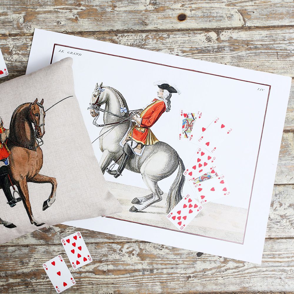 Репродукция "Верховая езда" - афиша ретро-коллекции, включившей мягкие стулья и декоративные подушки, повторяющие приключенческие сюжеты древних гравюр. Процитировав изображения на нескольких предметах, добиваемся авторского интерьерного эффекта, будто бы созданного художником по нашему персональному заказу.
