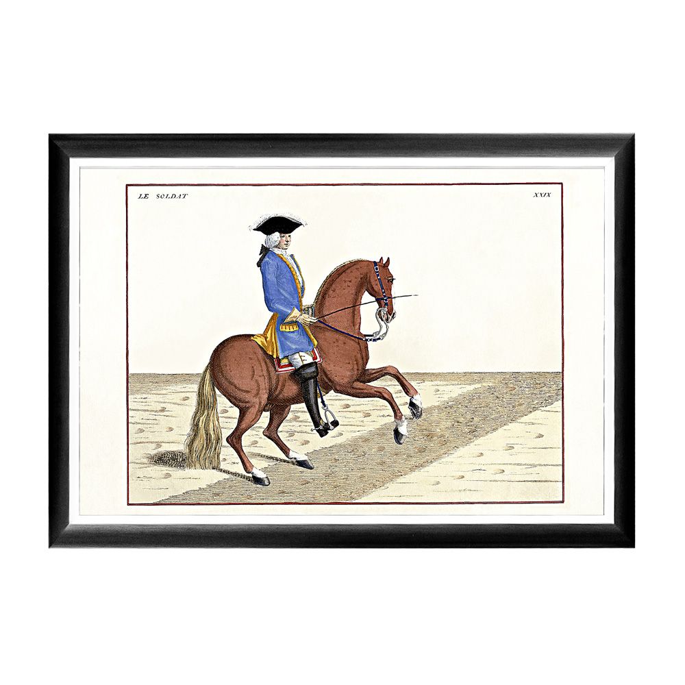 Кавалерист французской армии, позирующий на арт-постер "Верховая езда, Урок № 19", демонстрирует публике известнейший элемент верховой езды – "галоп".