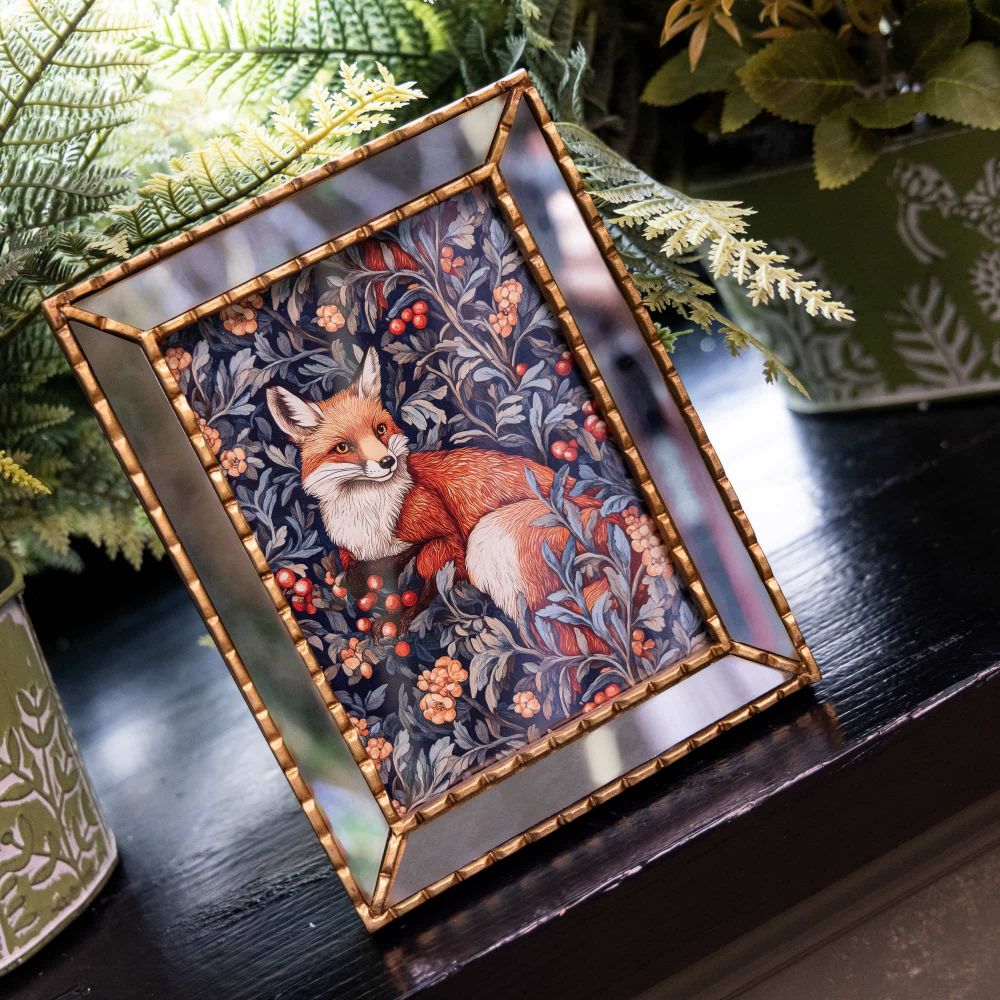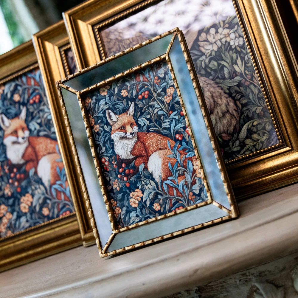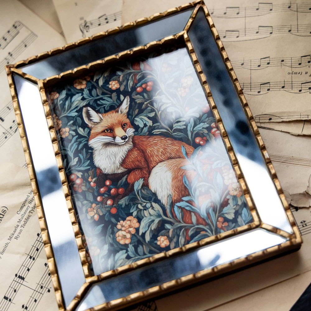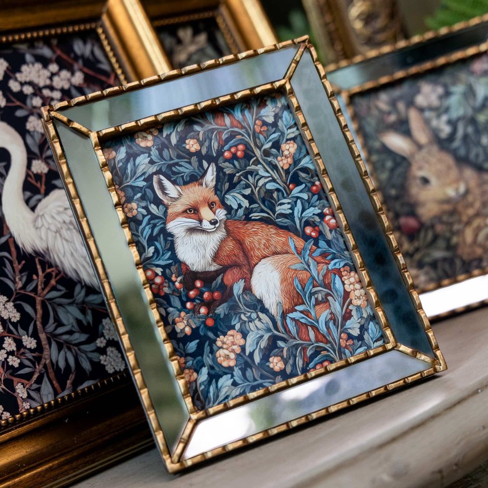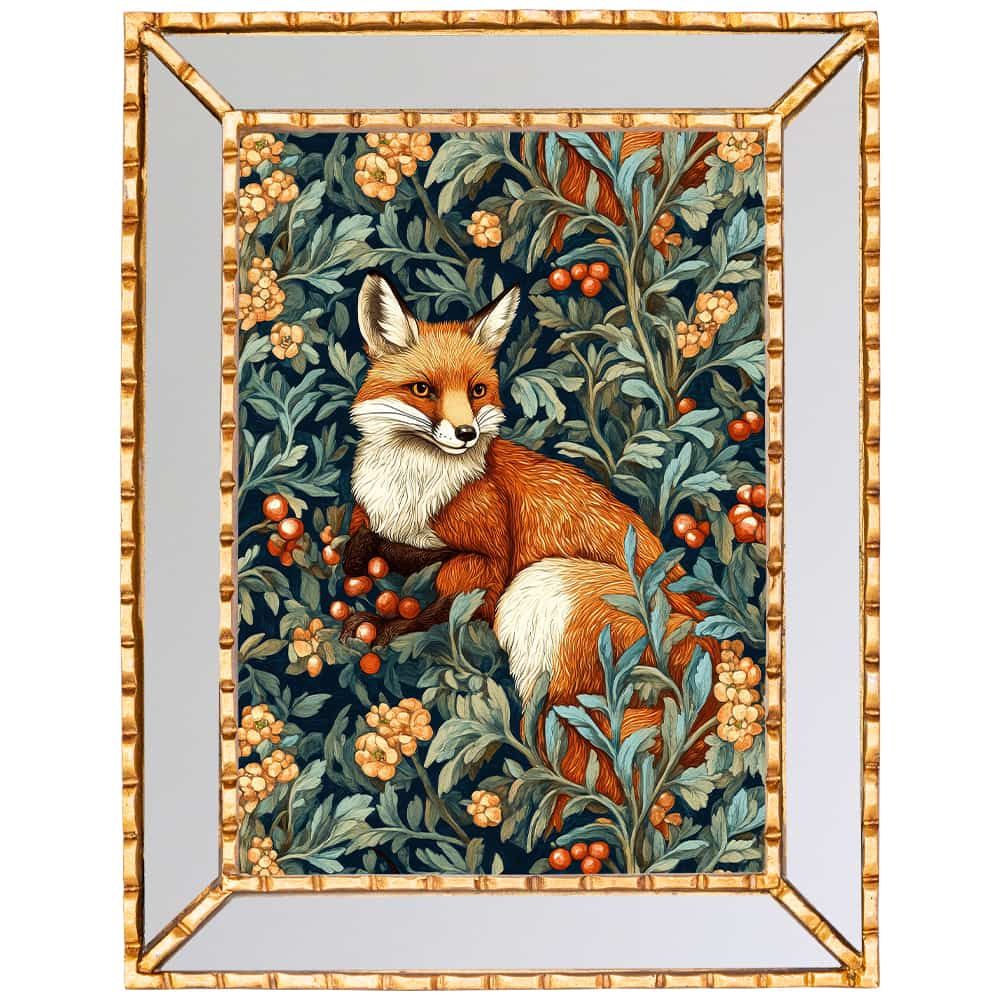Картина «Бал сказок. Лиса» в стиле Уильяма Морриса с изображением рыжей лесной красавицы обрамлена красивой зеркальной рамой, которая превращает картину в настоящую дизайнерский шедевр, добавляя множество отражений.