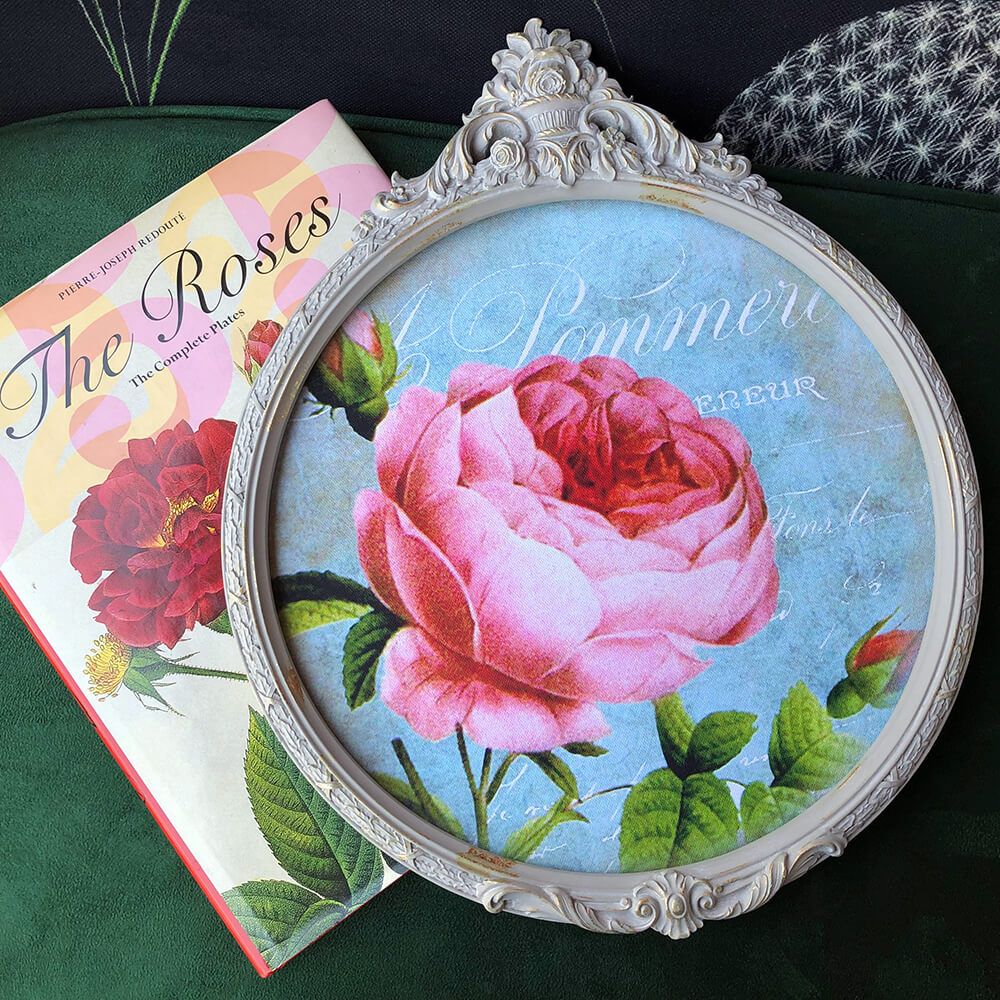 Репродукция компилирует акварель Пьера-Жозе́фа Редутэ (Pierre-Joseph Redouté, 1759—1840) — французского художника и ботаника, придворного живописца и литографа. Акварель вошла в его знаменитый альбом ботанических иллюстраций «Розы» (1802). В XIX веке эта книга занимало второе место среди самых дорогих печатных изданий мира. Альбом «Розы» по сей день почитается самой полной художественной энциклопедией семейства роз.
