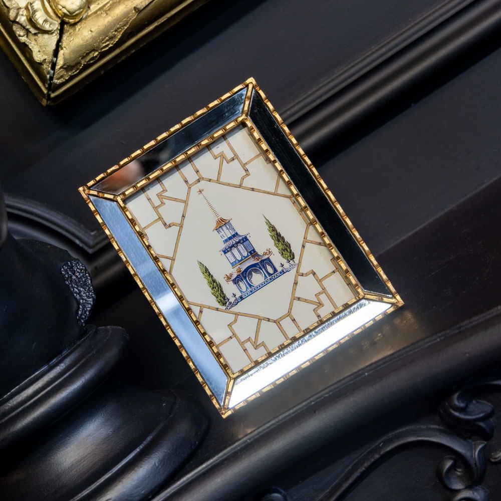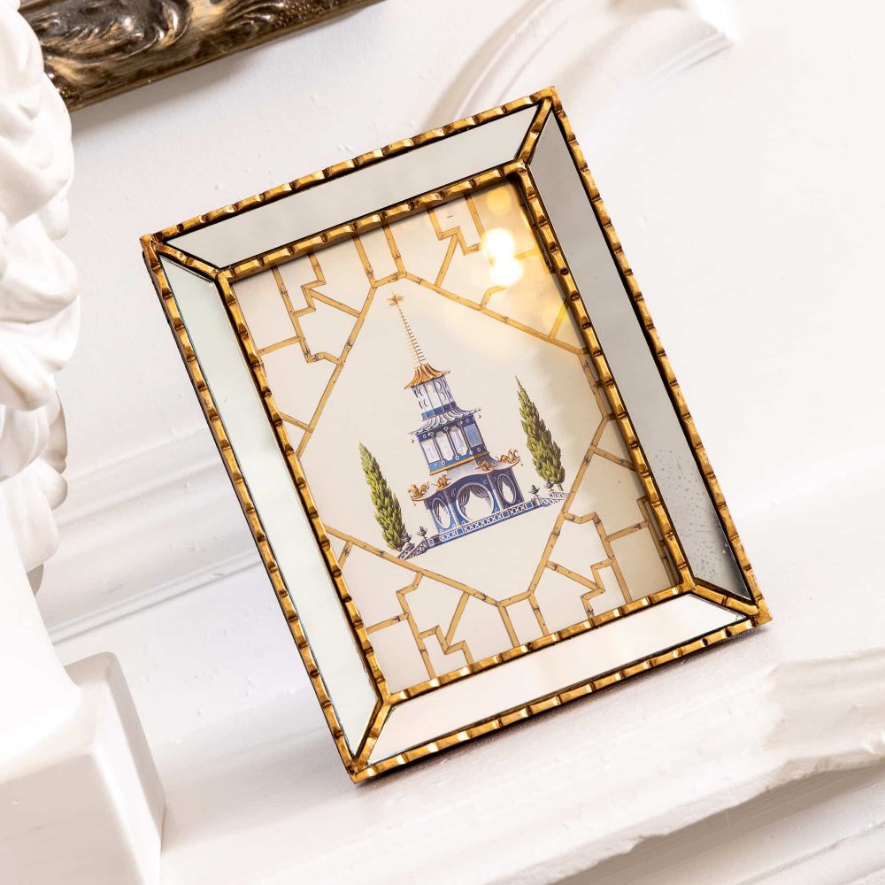Драгоценным сердцем этого дизайнерского объекта служит детализированное изображение старинной многоярусной садовой беседки — пагоды. Это не просто строение, а символ духовного восхождения в восточной культуре. Каждая деталь — изогнутые крыши, напоминающие полёт дракона, сводчатые окна, резные двери и вечнозелёные кипарисы — прорисована с любовью к китайскому искусству. Воплощая стиль шинуазри, картина становится мостом между европейской эстетикой и загадочной философией Поднебесной, привнося в дом атмосферу гармонии и созерцания.