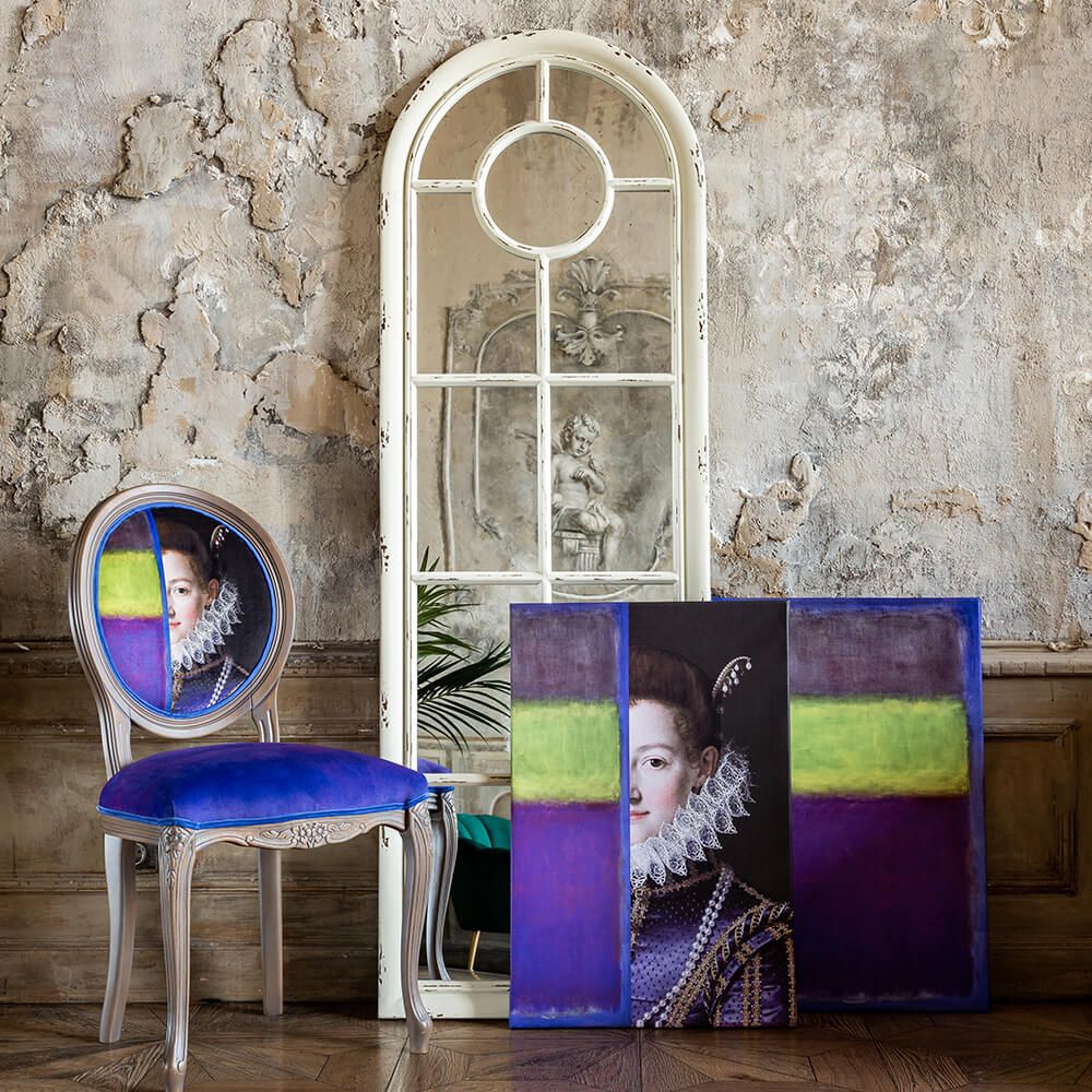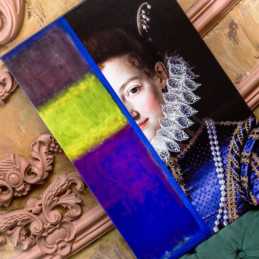 Что может быть смелее, чем соединить на одном холсте две эпохи? Арт-портрет «Кристина» — это художественный эксперимент, в котором сошлись величие прошлого и энергия современности. В основе — парадный портрет Кристины Лотарингской, великой герцогини Тосканской, внучки Екатерины Медичи, кисти мастера позднего Ренессанса Шипьоне Пульцоне (Иль Гаэтано). Его работа, фиксирующая «изящную позу и шикарный костюм» знати XVI века, обретает новое звучание благодаря абстрактным полям цвета Марка Ротко, одного из столпов абстрактного экспрессионизма. Этот союз — квинтэссенция модной эклектики, где классика не просто соседствует с современностью, а взаимообогащается, рождая выразительность, загадку и салонный шарм.