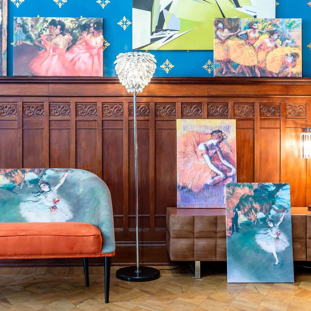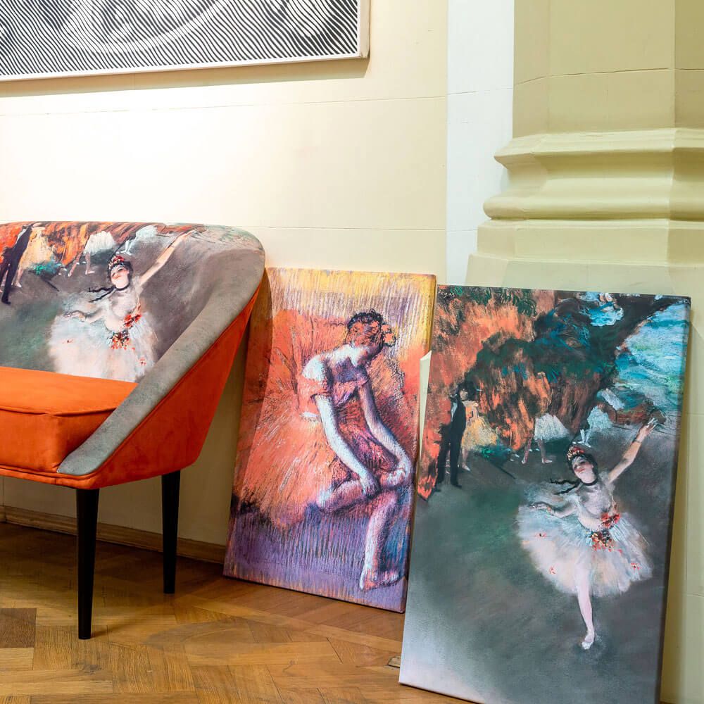Это не просто изображение балерины. Это остановленное мгновение, запечатленное «летописцем балета». Картина Дега привносит в пространство особую атмосферу: закулисную магию, торжественность момента и виртуозность исполнения, отраженную в уникальной авторской манере художника.