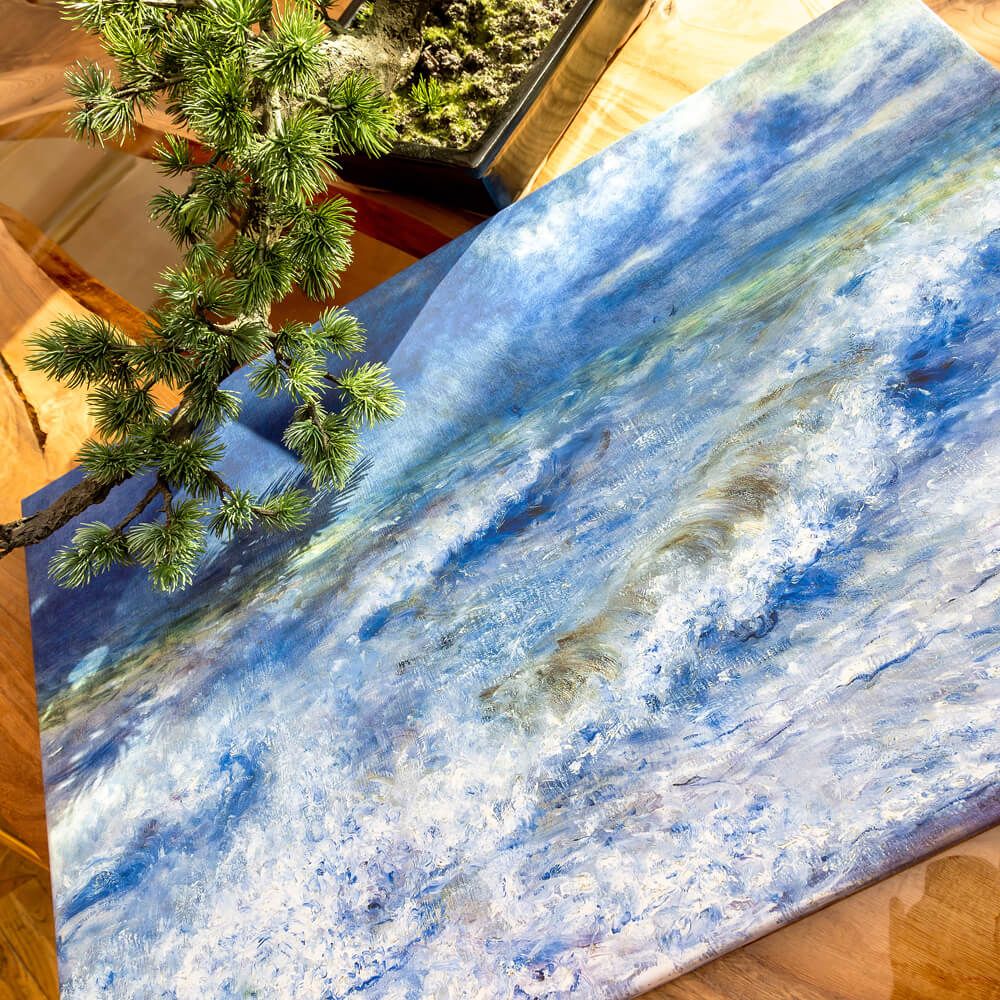 Материалы и исполнение: Профессиональная печать на холсте с точной цветопередачей позволяет передать все нюансы оригинальной палитры — от глубоких синих и фиолетовых тонов моря до пронзительных всполохов света . Холст вручную натянут на глубокий подрамник из натурального дерева методом галерейной натяжки. Изображение продолжается на торцах, создавая иллюзию самостоятельного художественного объекта, не требующего рамы.