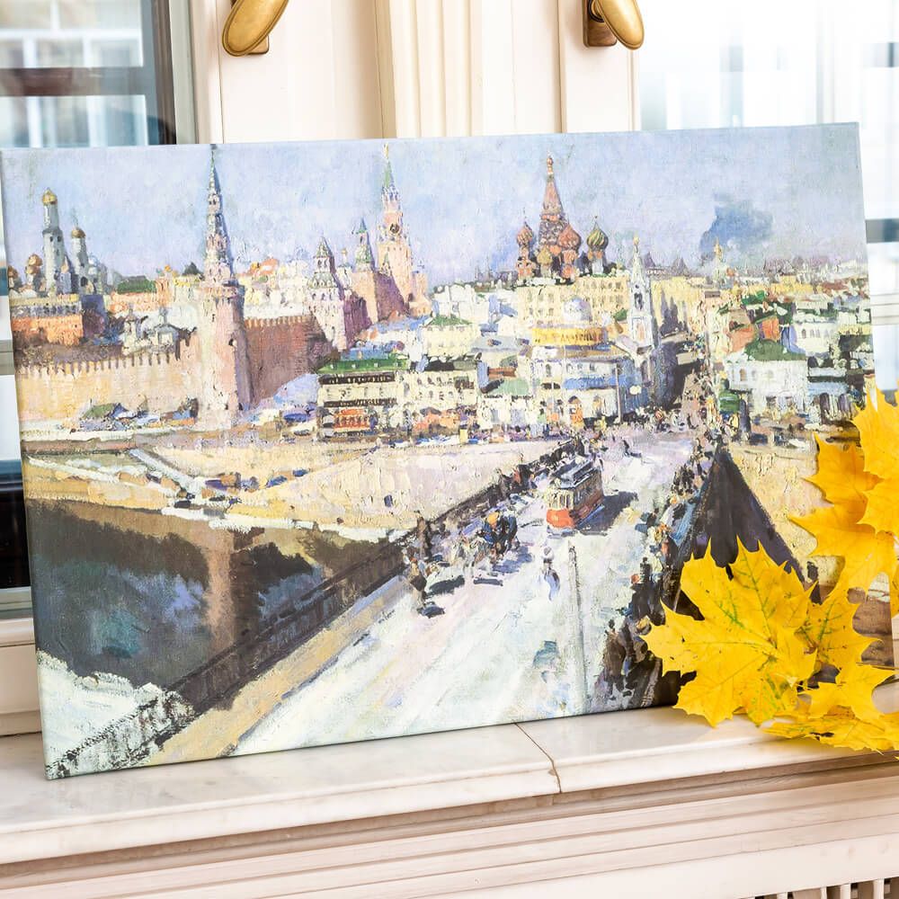 Материалы и исполнение: Профессиональная печать на холсте с точнейшей цветопередачей. Мы воспроизводим «яркие, чистые, смелые краски» мастера: лиловые тени на стенах Кремля, изумрудные крыши, солнечные блики на воде . Холст вручную натянут на глубокий подрамник из натурального дерева методом галерейной натяжки.