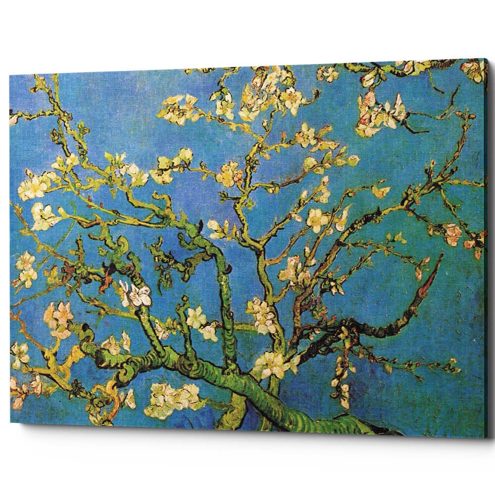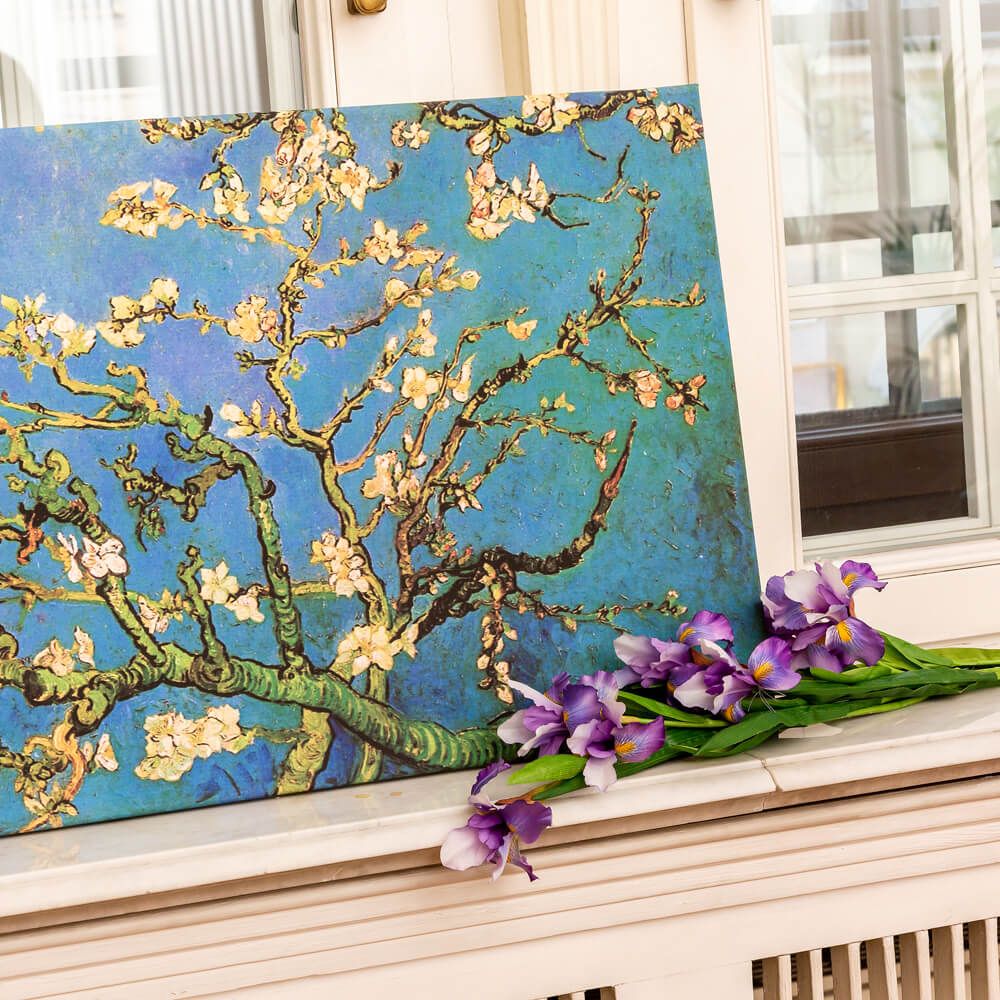 Исключительная детализация и цветопередача. Профессиональная печать позволяет передать всю тонкость работы: четкие контуры ветвей миндаля, нежнейшие оттенки бело-голубых лепестков и бирюзового неба, характерные для Ван Гога энергичные, но здесь более сдержанные мазки. Сохраняется контраст между цветущими ветвями и фоном.