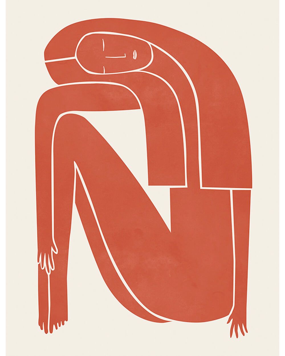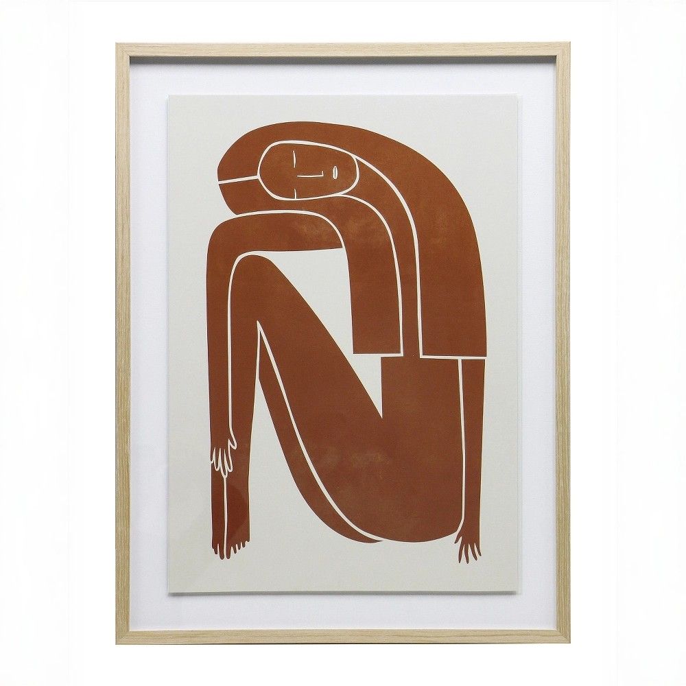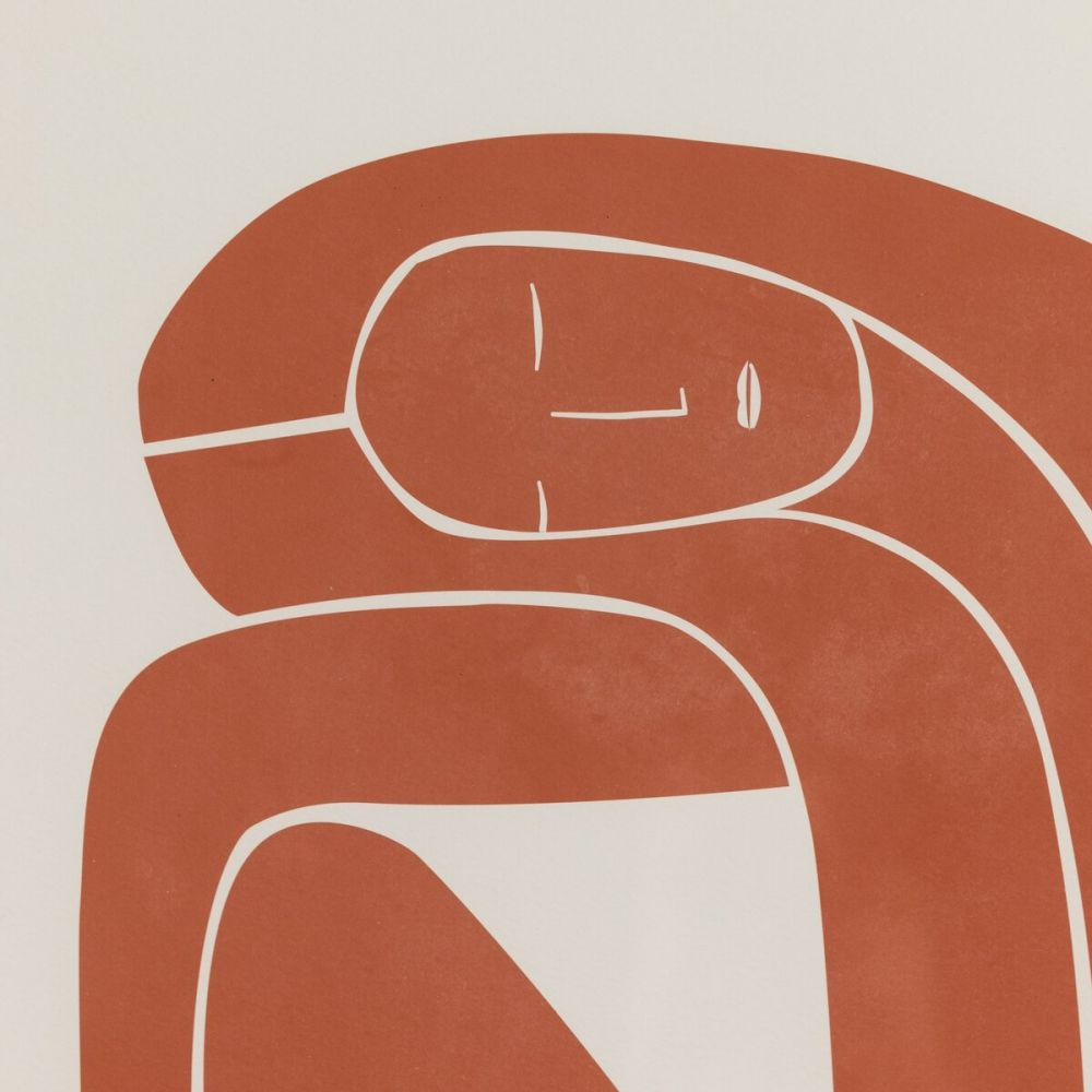 Этот постер — идеальный баланс между понятным образом и художественной условностью. Стилизованная фигура человека, собранная из плавных линий и геометрических форм, дышит расслабленностью и умиротворением. Теплая, почти монохромная гамма коричневых, бежевых и терракотовых оттенков создает невероятно уютное и тактильное ощущение, словно наполняя комнату мягким светом.