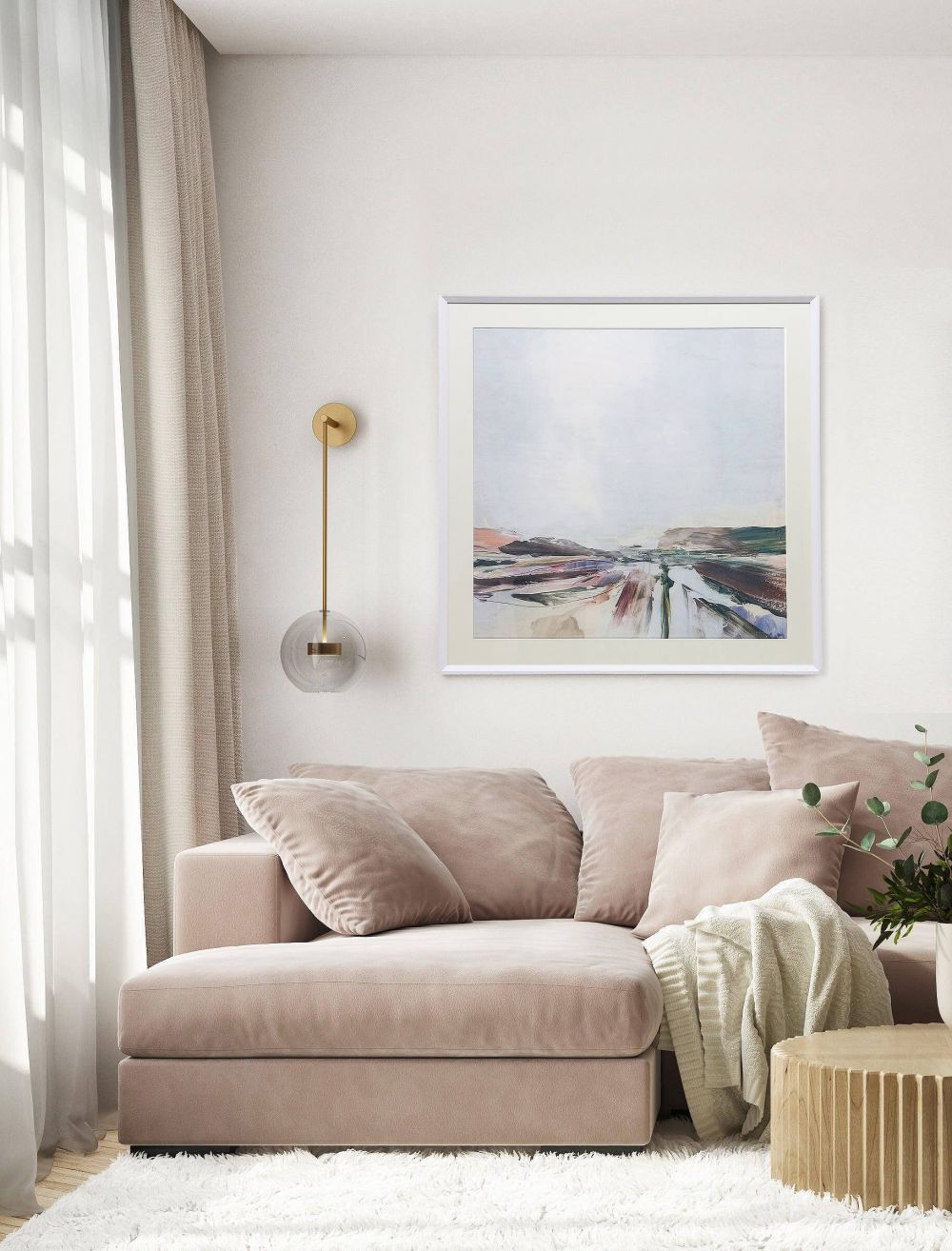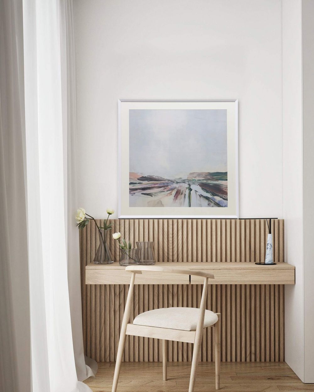 Многие морские пейзажи слишком конкретны и ярки, создавая скорее курортное, чем умиротворенное настроение. В современном пространстве нужен образ, который работает на подсознание — через цвет, форму и свет передает ощущение легкого бриза, теплого песка и спокойной воды, создавая фон для отдыха и созерцания.