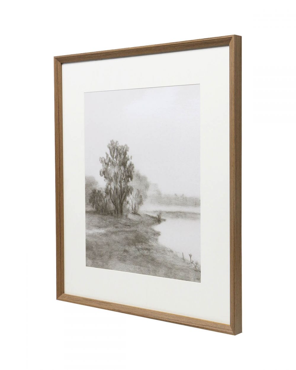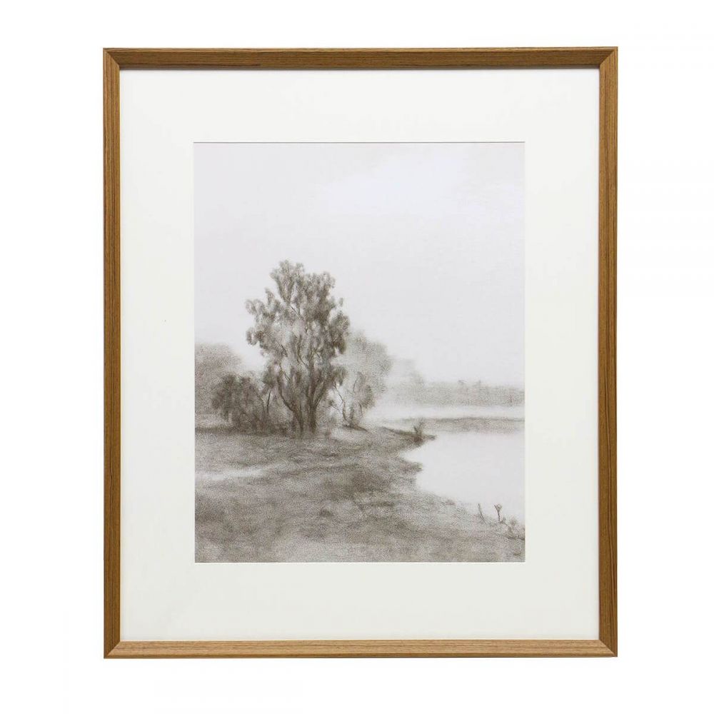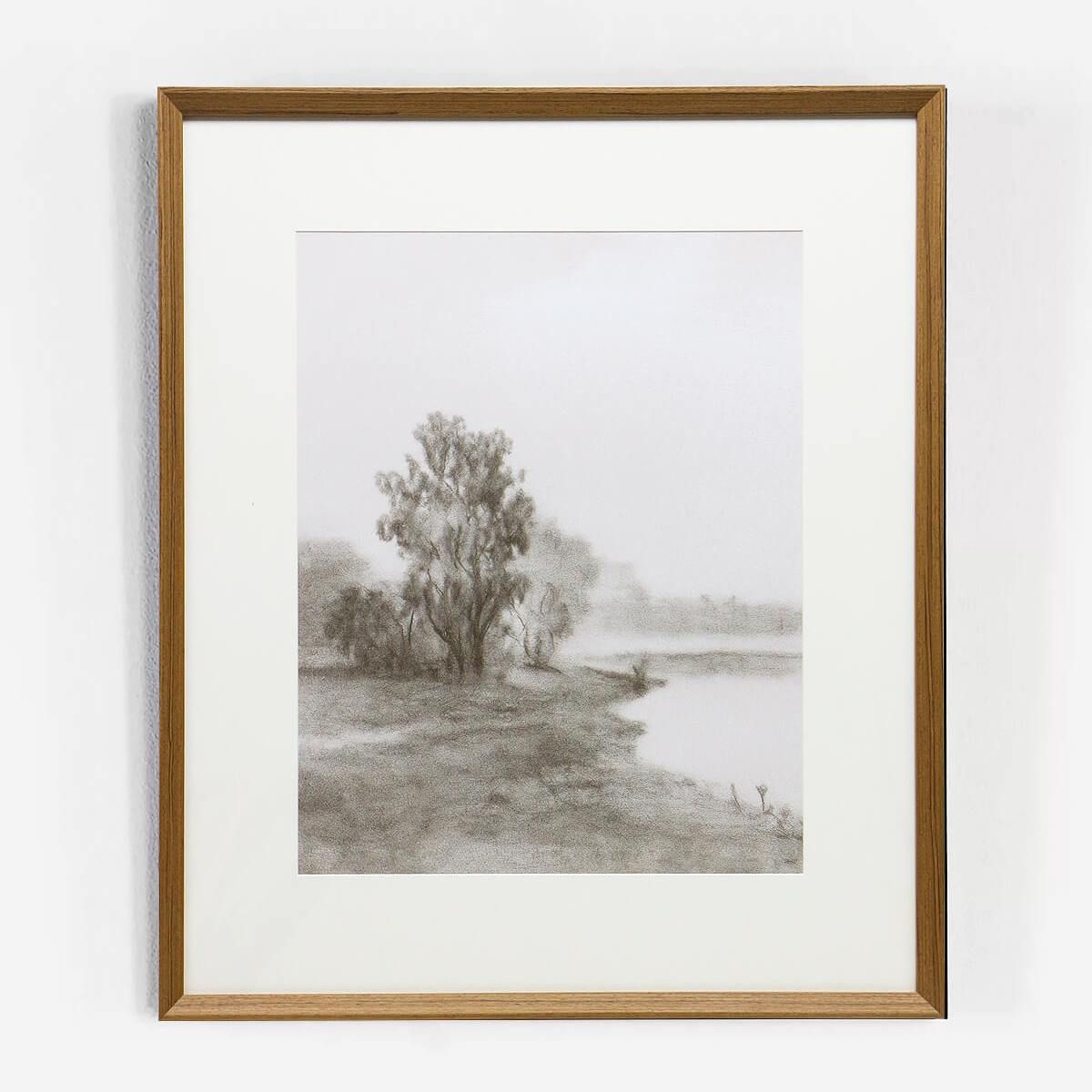 Этот постер — это не фотография и не цифровая графика. Это репродукция рисунка, выполненного графитным карандашом, где каждый штрих, каждая тональная растяжка имеют значение. Художник мастерски передает атмосферу туманного утра у водоема: размытые контуры величественного дерева, едва намеченная гладь воды, воздушность пространства. Это искусство намека и тончайшей светотени, наполняющее пространство не цветом, а глубоким, почти осязаемым спокойствием.
