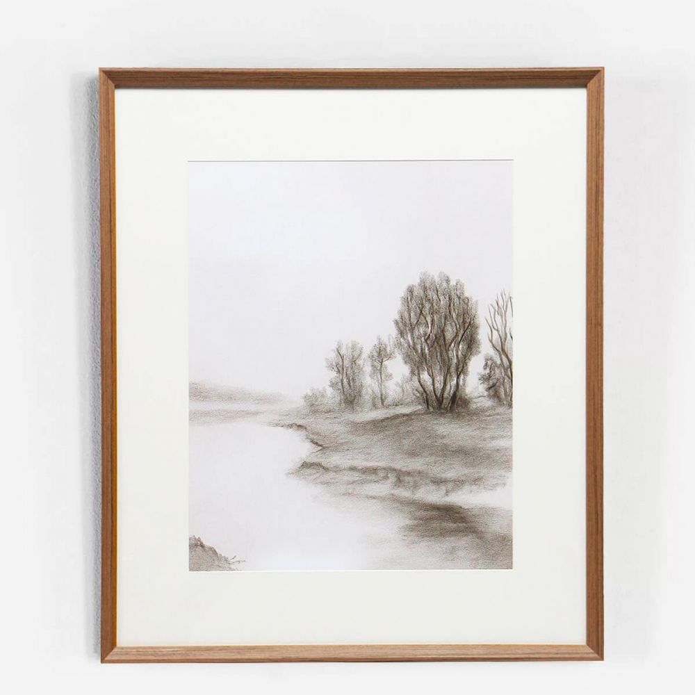 Этот постер — вторая часть диптиха, продолжающая исследование тишины и света в технике графитного карандаша. Как и первая работа, она запечатлевает умиротворенный пейзаж у воды, где мягкие, размытые контуры деревьев растворяются в туманном воздухе. Виртуозная штриховка и тончайшие тональные переходы создают не изображение, а впечатление — шелест листвы, дрожь на воде, ощущение свежего утра. Это искусство, которое говорит шепотом, но говорит очень выразительно.