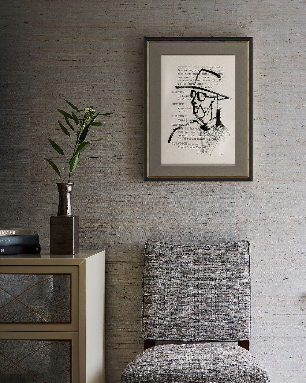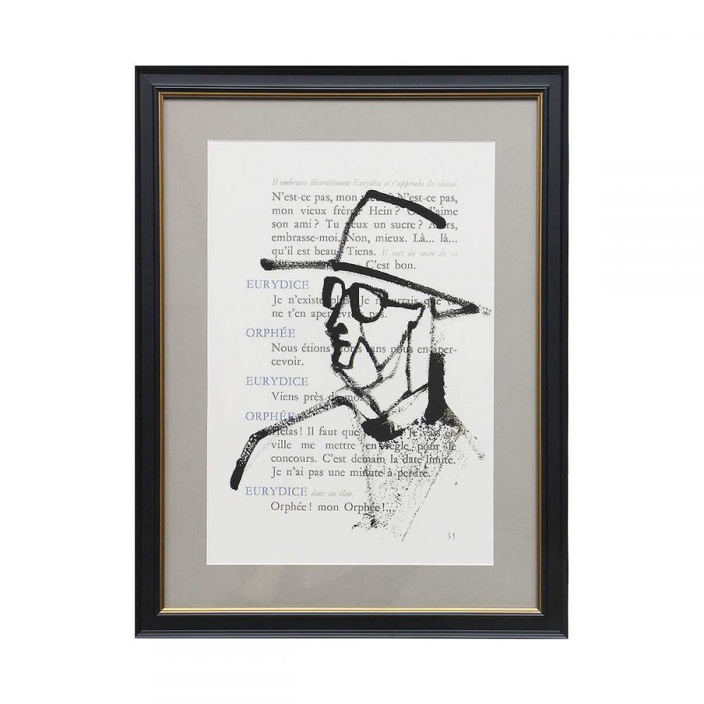 Этот постер — уникальный синтез литературы и графики. Это не просто рисунок, а чернильный набросок, нанесенный прямо на страницу из знаменитой пьесы «Орфей» французского авангардиста Жана Кокто. Экспрессивный, минималистичный силуэт героя, созданный несколькими смелыми мазками, ведет диалог с текстом пьесы, создавая многомерное художественное высказывание. Это декор для тех, кто ценит историю, контекст и интеллектуальную провокацию в искусстве.