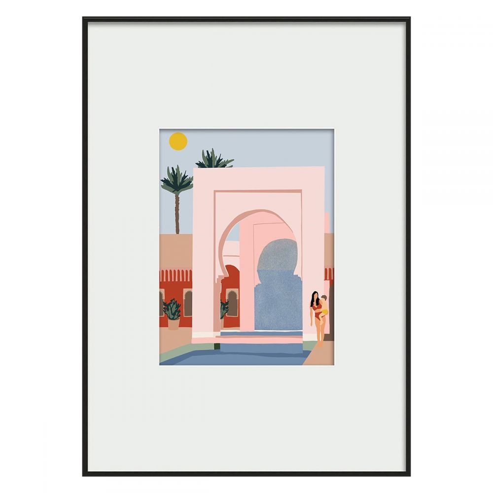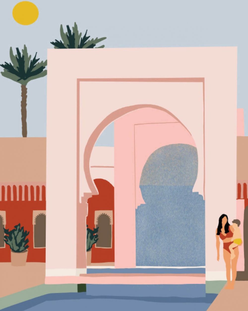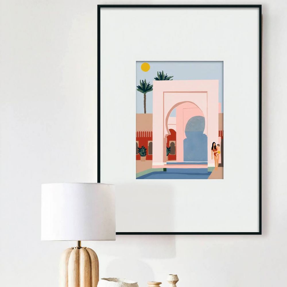Жикле «Mom & Son» — это и есть тот самый теплый, душевный акцент. Это яркая иллюстрация в популярном стиле бохо, изображающая женщину с сыном на фоне изящной марокканской арки. Но важна не только тема, а то, как она подана. Экзотическая цветовая гамма, где теплые розовые и желтые тона контрастируют с прохладными голубыми и зелеными, создает визуальную энергию и жизнерадостность. Это не просто «красивая картинка» — это художественный образ материнства, нежности и связи, который наполнит любую комнату особым, светлым настроением.