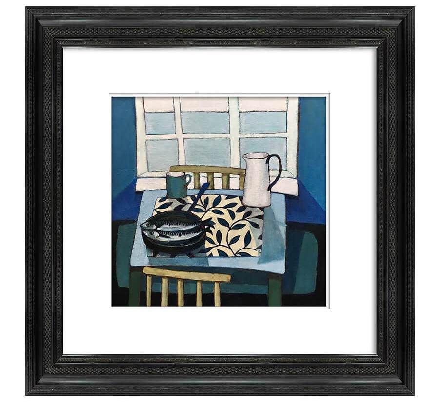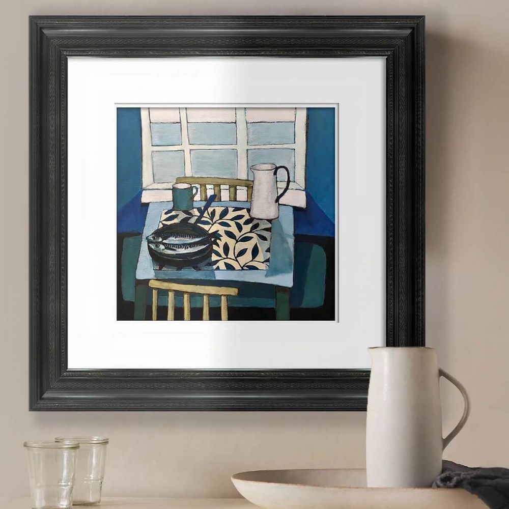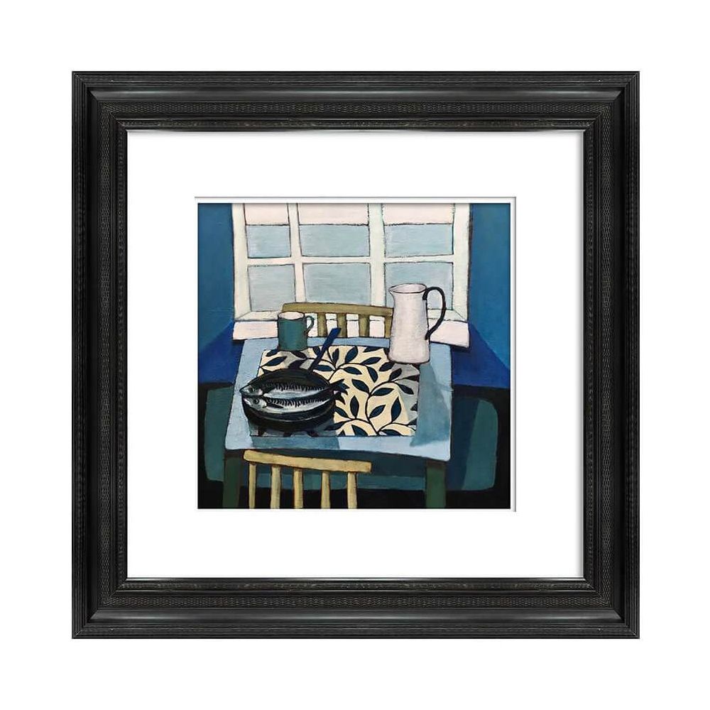 Жикле «Mackerel and jug» — это и есть тот самый уголок спокойствия, заключенный в идеальный квадрат. Это не просто натюрморт с рыбой и кувшином. Это тонко выверенная композиция, где каждая деталь — сдержанная цветовая гамма, игра естественного света и мягких теней, графичный узор черно-белой скатерти — работает на создание атмосферы умиротворения. В работе нет ничего лишнего, только баланс, элегантность и глубокая, почти медитативная гармония. Такая картина приносит в дом не просто декор, а настроение.