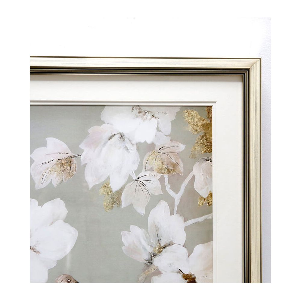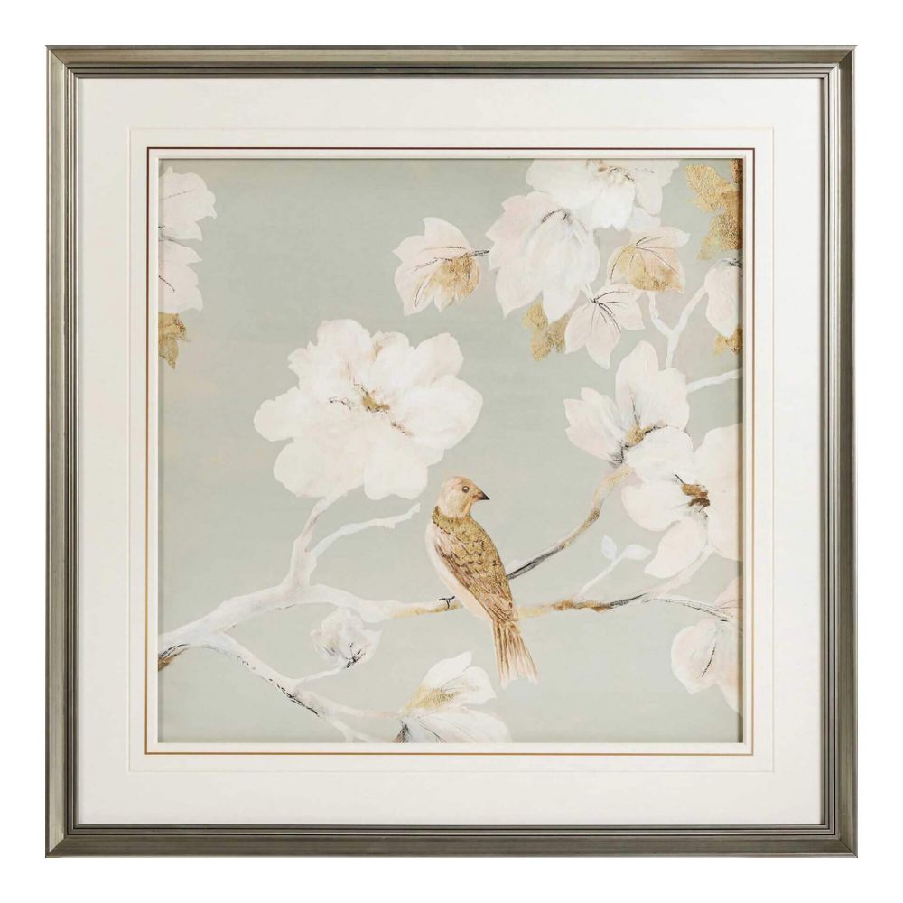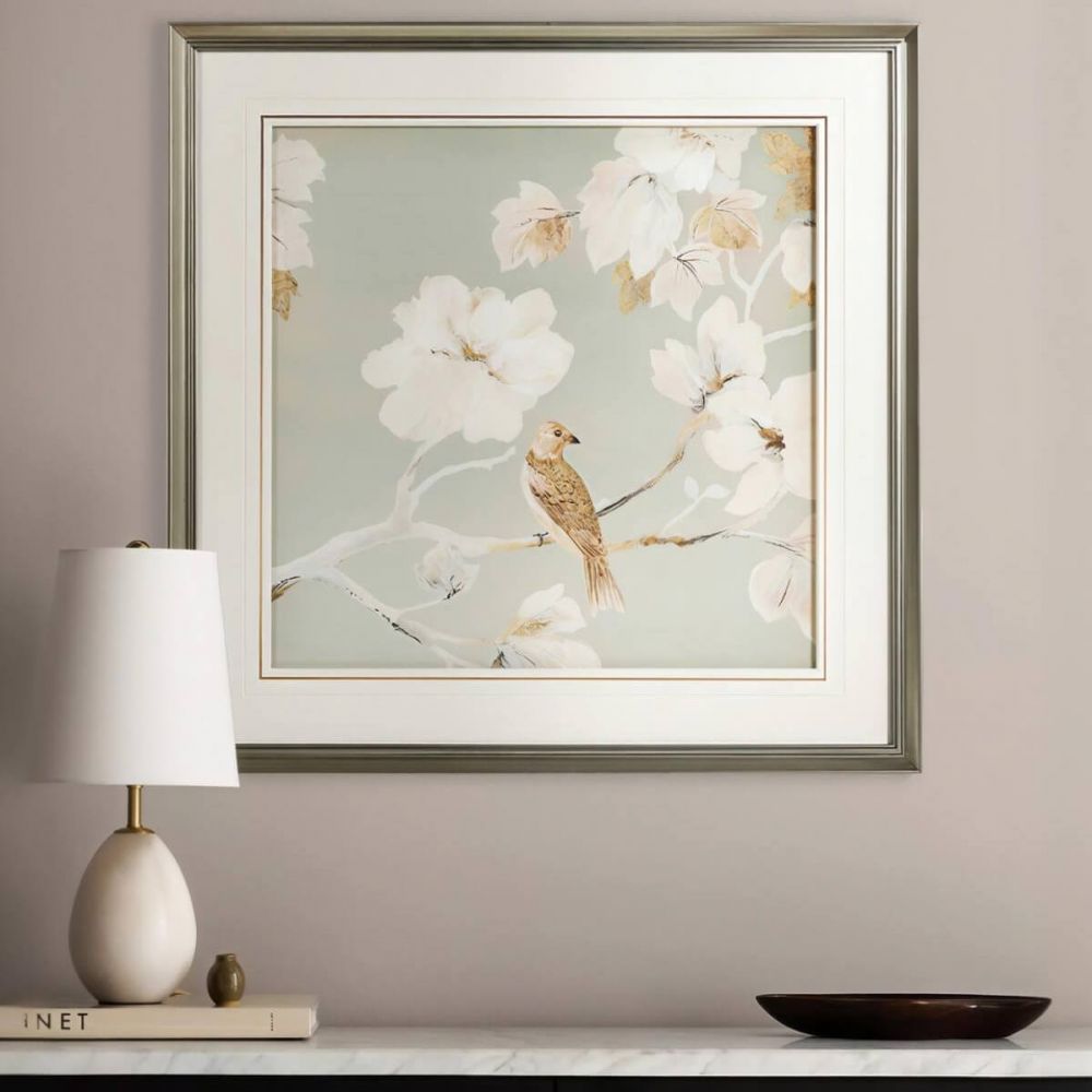 Наше предложение — постер «Birds and flowers – II» из одноименной серии. Это готовая картина в раме, где нежная иллюстрация птицы на ветке магнолии становится цельным арт-объектом. Он привносит в пространство гармонию природы, оформленную в лаконичном современном стиле, создавая мгновенный фокус внимания и задавая настроение всей комнате.