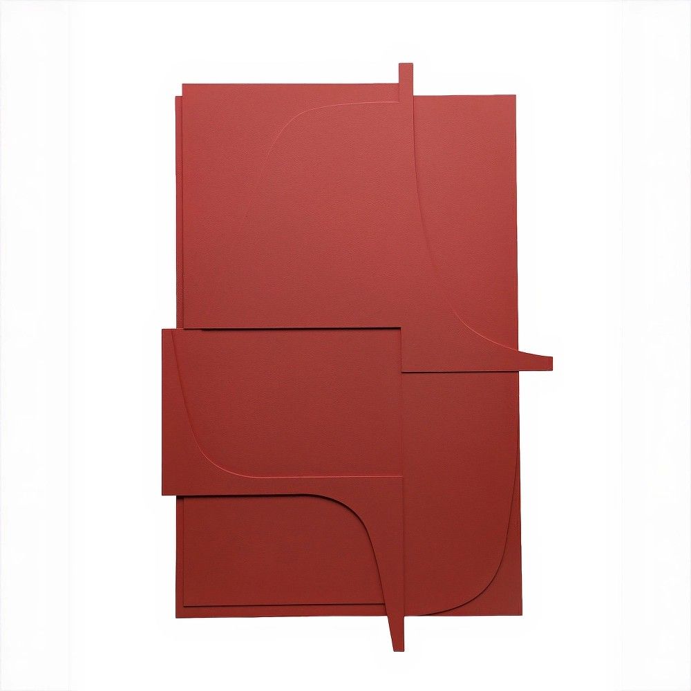 Интерьерное панно «Уэйлон» воплощает этот баланс с редкой элегантностью. Композиция построена из нескольких слоев матового материала красного цвета, вырезанных в плавных, изогнутых и геометрически выверенных формах. Эти слои создают ощущение архитектурной глубины и объема, приглашая рассматривать панно с разных углов и каждый раз находить новые детали.