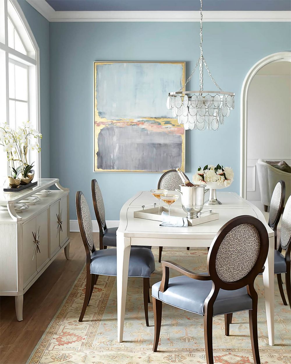 В помещении с сине-золотой гаммой. Станет идеальным завершающим аккордом, поддерживающим цветовую тему.